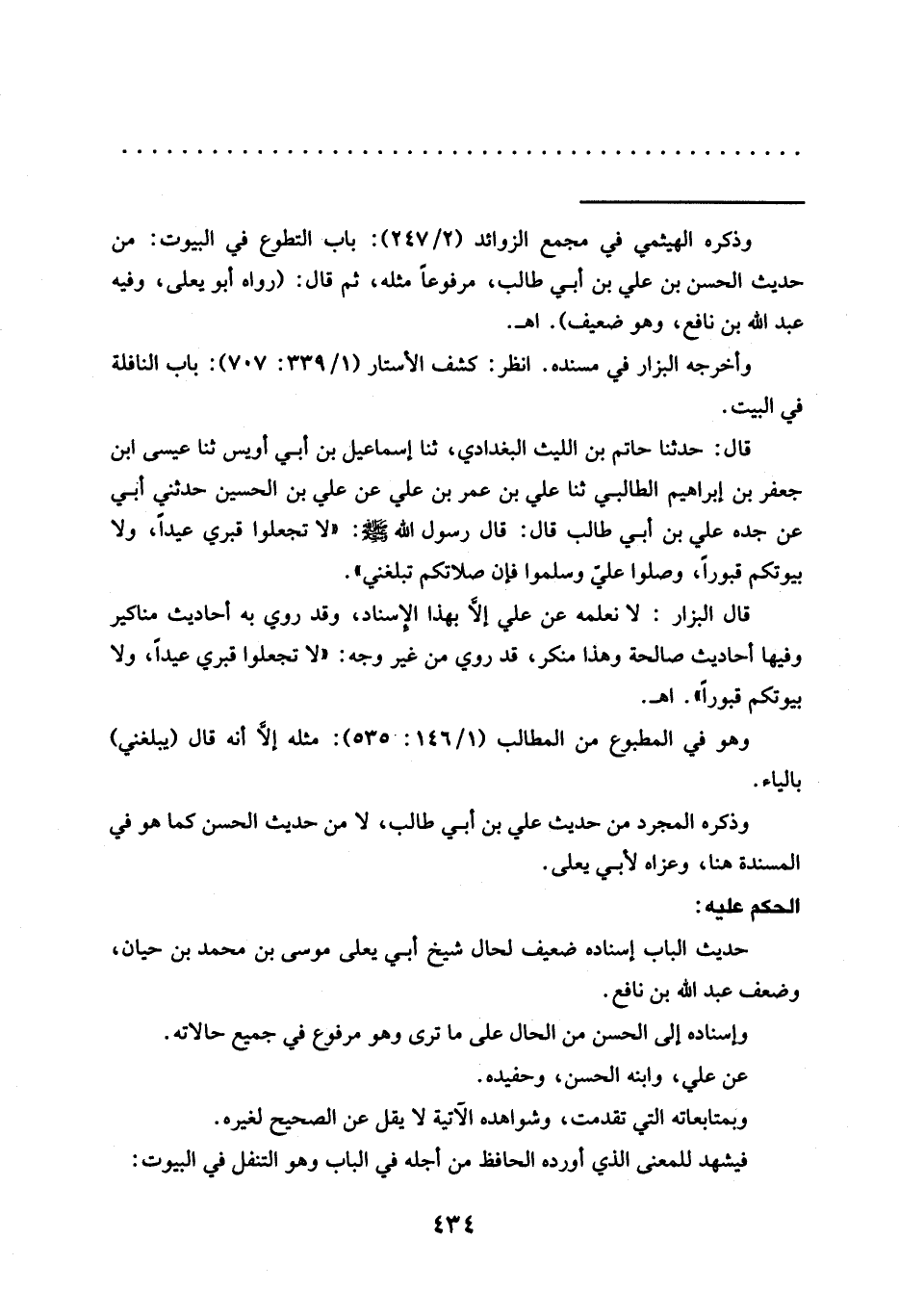 قال البزار: لَا نَعْلَمْهُ عَنْ عَلِيٍّ إلَّا بِهَذَا الإِسناد، وقد روي به أحاديث مناكير وفيها أحاديث صالحة وهذا منكر، قد روي من غير وجه: "لا تجعلوا قبري عيدًا، ولا بيوتكم قبورًا". اهـ.
