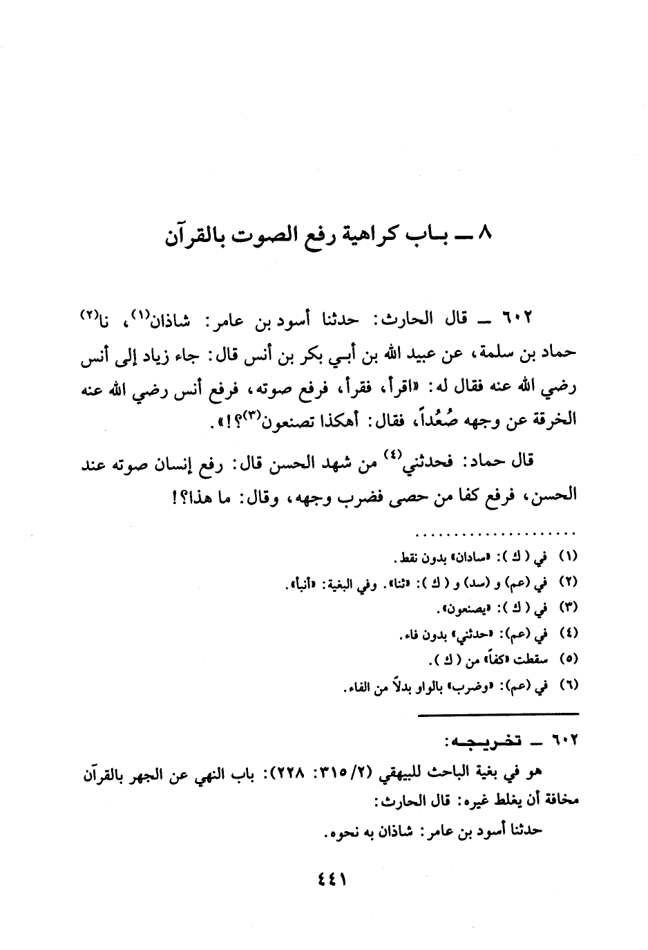 602 - قَالَ الْحَارِثُ حَدَّثَنَا أَسْوَدُ بْنُ عَامِرٍ شَاذَانَ نا حَمَّادُ بْنُ سَلَمَةَ عَنْ عُبَيْدِ اللَّهِ بْنِ أَبِي بَكْرِ بْنِ أَنَسٍ قَالَ جَاءَ زِيَادٌ إِلَى أَنَسٍ رَضِيَ اللَّهُ عَنْهُ فَقَالَ لَهُ اقْرَأْ فَقَرَأَ فَرَفَعَ صَوْتَهُ §فَرَفَعَ أَنَسٌ رَضِيَ اللَّهُ عَنْهُ الْخِرْقَةَ عَنْ وَجْهِهِ صُعُدًا فَقَالَ أَهَكَذَا تَصْنَعُونَ