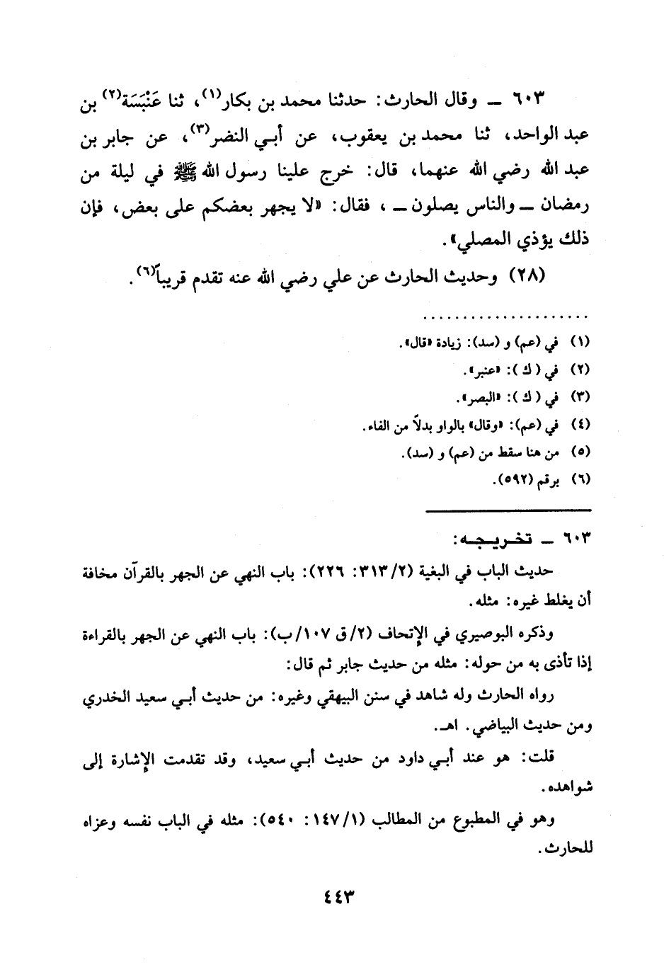603 - وَقَالَ الْحَارِثُ حَدَّثَنَا مُحَمَّدُ بْنُ بَكَّارٍ ثنا عَنْبَسَةُ بْنُ عَبْدِ الْوَاحِدِ ثنا مُحَمَّدُ بْنُ يَعْقُوبَ عَنْ أَبِي النَّضْرِ عَنْ جَابِرِ بْنِ عَبْدِ اللَّهِ رَضِيَ اللَّهُ عَنْهُمَا قَالَ خَرَجَ عَلَيْنَا رَسُولُ اللَّهِ صَلَّى اللَّهُ عَلَيْهِ وَسَلَّمَ صَلَّى اللَّهُ عَلَيْهِ وَسَلَّمَ فِي لَيْلَةٍ مِنْ رَمَضَانَ وَالنَّاسُ يُصَلُّونَ فَقَالَ " §لَا يَجْهَرْ بَعْضُكُمْ عَلَى بَعْضٍ فَإِنَّ ذَلِكَ يُؤْذِي الْمُصَلِّي "