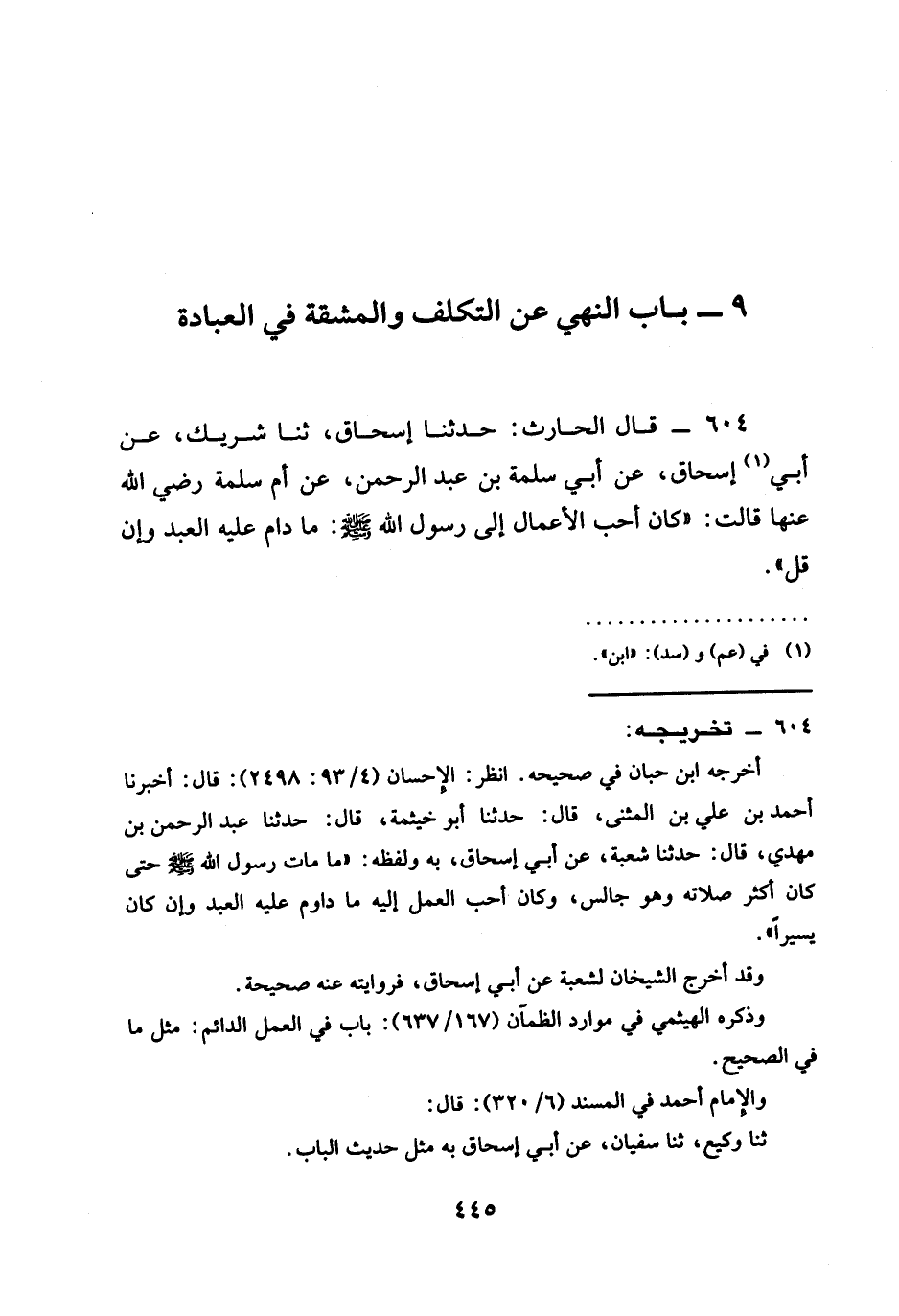 604 - قَالَ الْحَارِثُ حَدَّثَنَا إِسْحَاقُ ثنا شَرِيكٌ عَنْ أَبِي إِسْحَاقَ عَنْ أَبِي سَلَمَةَ بْنِ عَبْدِ الرَّحْمَنِ عَنْ أُمِّ سَلَمَةَ رَضِيَ اللَّهُ عَنْهَا قَالَتْ " كَانَ §أَحَبُّ الْأَعْمَالِ إِلَى رَسُولِ اللَّهِ صَلَّى اللَّهُ عَلَيْهِ وَسَلَّمَ مَا دَامَ عَلَيْهِ الْعَبْدُ وَإِنْ قَلَّ "