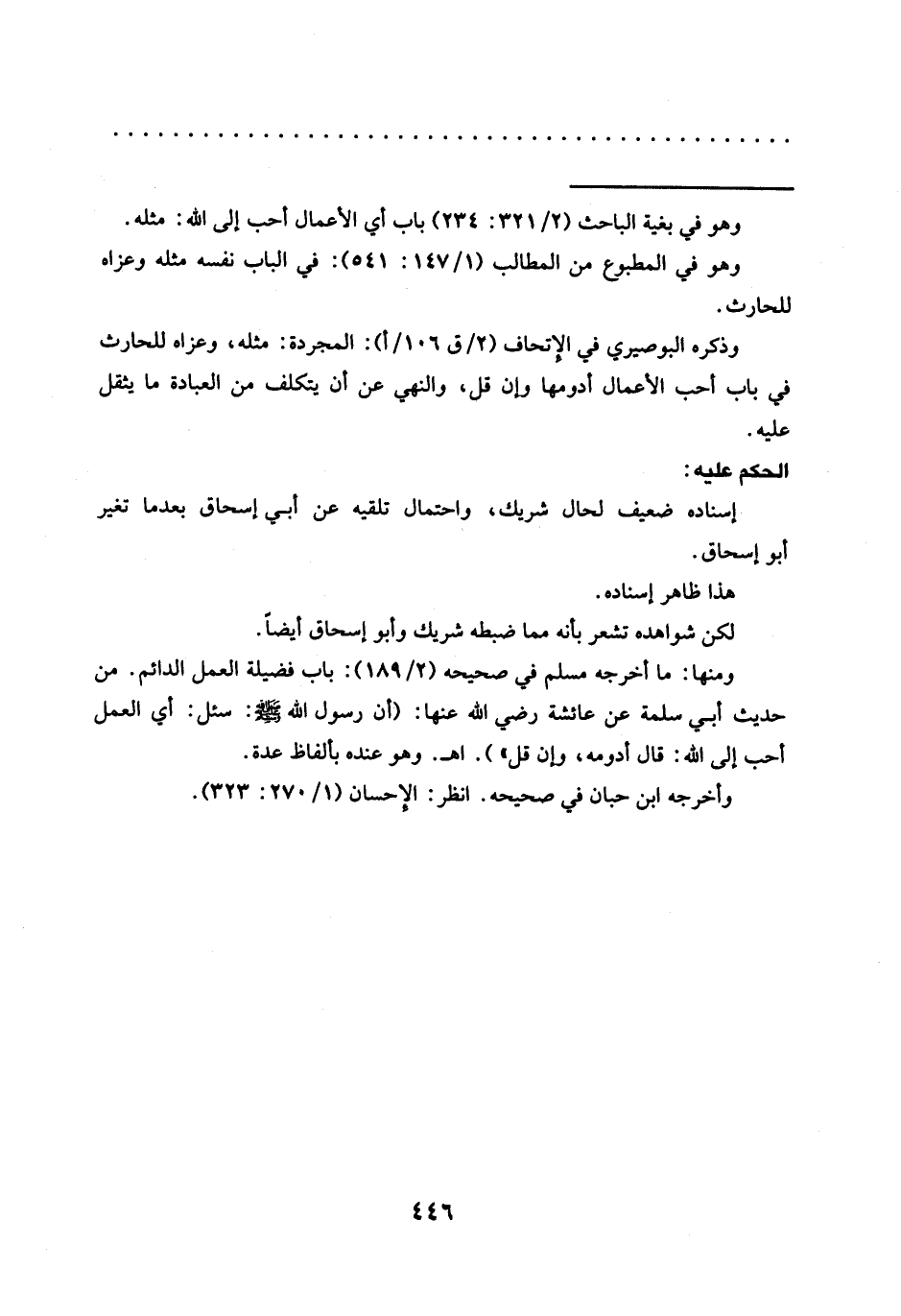 ومنها: ما أخرجه مسلم في صحيحه (2/ 189): باب فضيلة العمل الدائم. من حديث أبي سلمة عن عائشة رَضِيَ اللَّهُ عَنْهَا: (أَنَّ رَسُولَ اللَّهِ - صَلَّى الله عليه وسلم -: سئل: أي العمل أحب إلى الله: قال "أدومه، وإن قل"). اهـ. وهو عنده بألفاظ عدة.
