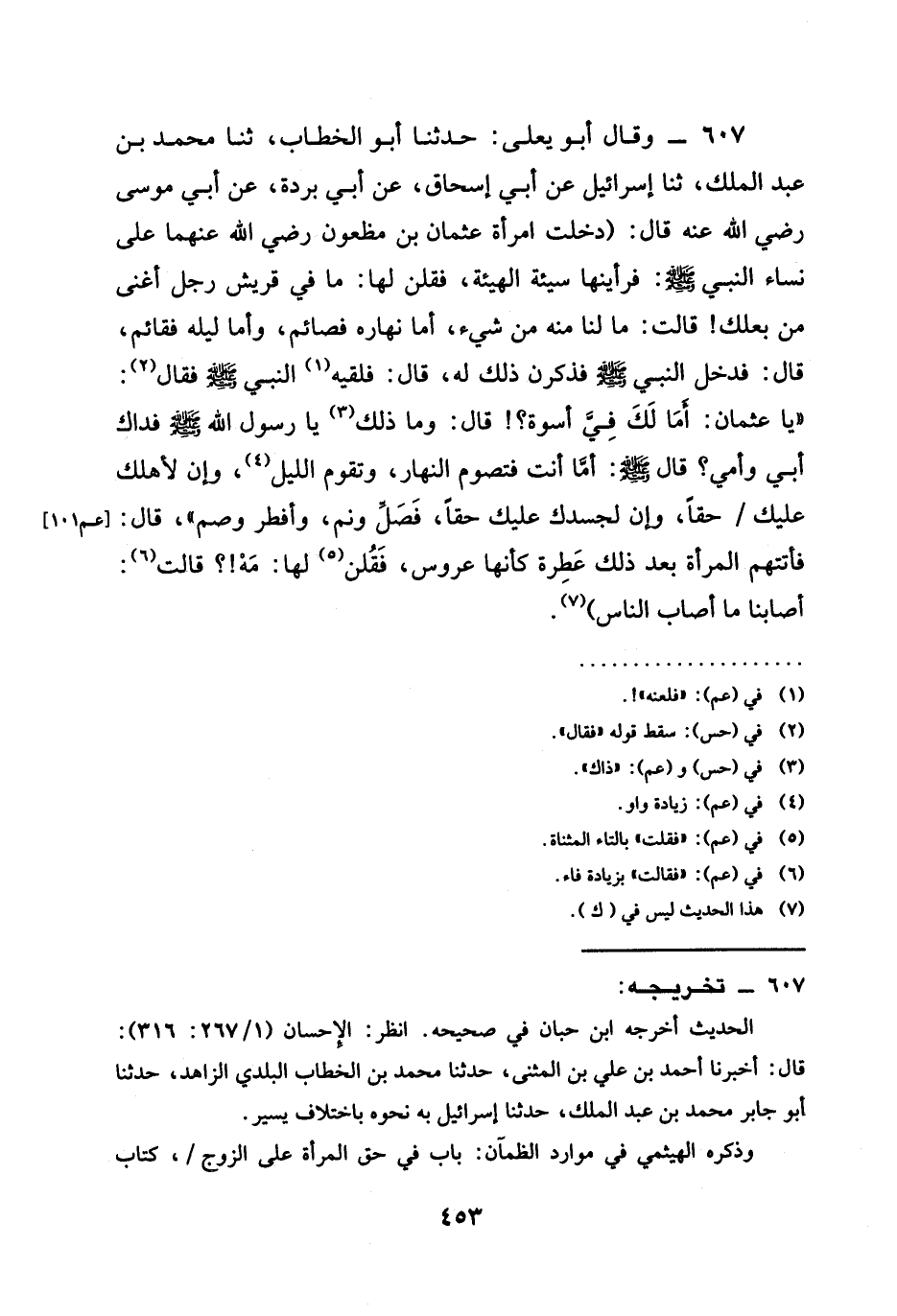 607 - وَقَالَ أَبُو يَعْلَى حَدَّثَنَا أَبُو الْخَطَّابِ ثنا مُحَمَّدُ بْنُ عَبْدِ الْمَلِكِ ثنا إِسْرَائِيلُ عَنْ أَبِي إِسْحَاقَ عَنْ أَبِي بُرْدَةَ عَنْ أَبِي مُوسَى رَضِيَ اللَّهُ عَنْهُ قَالَ (دَخَلَتِ امْرَأَةُ عُثْمَانَ بْنِ مَظْعُونٍ رَضِيَ اللَّهُ عَنْهُمَا عَلَى نِسَاءِ النَّبِيِّ صَلَّى اللَّهُ عَلَيْهِ وَسَلَّمَ فَرَأَيْنَهَا سَيِّئَةَ الْهَيْئَةِ فَقُلْنَ لَهَا مَا فِي قُرَيْشٍ رَجُلٌ أَغْنَى مِنْ بَعْلِكِ قَالَتْ مَا لَنَا مِنْهُ مِنْ شَيْءٍ أَمَّا نَهَارُهُ فَصَائِمٌ وَأَمَّا لَيْلُهُ فَقَائِمٌ قَالَ فَدَخَلَ النَّبِيُّ صَلَّى اللَّهُ عَلَيْهِ وَسَلَّمَ فَذَكَرْنَ ذَلِكَ لَهُ قَالَ فَلَقِيَهُ النَّبِيُّ صَلَّى اللَّهُ عَلَيْهِ وَسَلَّمَ فَقَالَ " يَا عُثْمَانُ §أَمَا لَكَ فِيَّ أُسْوَةٌ قَالَ وَمَا ذلكَ يَا رَسُولَ اللَّهِ صَلَّى اللَّهُ عَلَيْهِ وَسَلَّمَ فِدَاكَ أَبِي وَأُمِّي قَالَ صَلَّى اللَّهُ عَلَيْهِ وَسَلَّمَ أَمَّا أَنْتَ فَتَصُومُ النَّهَارَ وَتَقُومُ اللَّيْلَ وإن لِأَهْلِكَ عَلَيْكَ حَقًّا وَإِنَّ لِجَسَدِكَ عَلَيْكَ حَقًّا فَصَلِّ وَنَمْ وَأَفْطِرْ وَصُمْ قَالَ فَأَتَتْهُمُ الْمَرْأَةُ بَعْدَ ذَلِكَ عَطِرَةً كَأَنَّهَا عَرُوسٌ فَقُلْنَ لَهَا مَهْ قَالَتْ أَصَابَنَا مَا أَصَابَ النَّاسُ