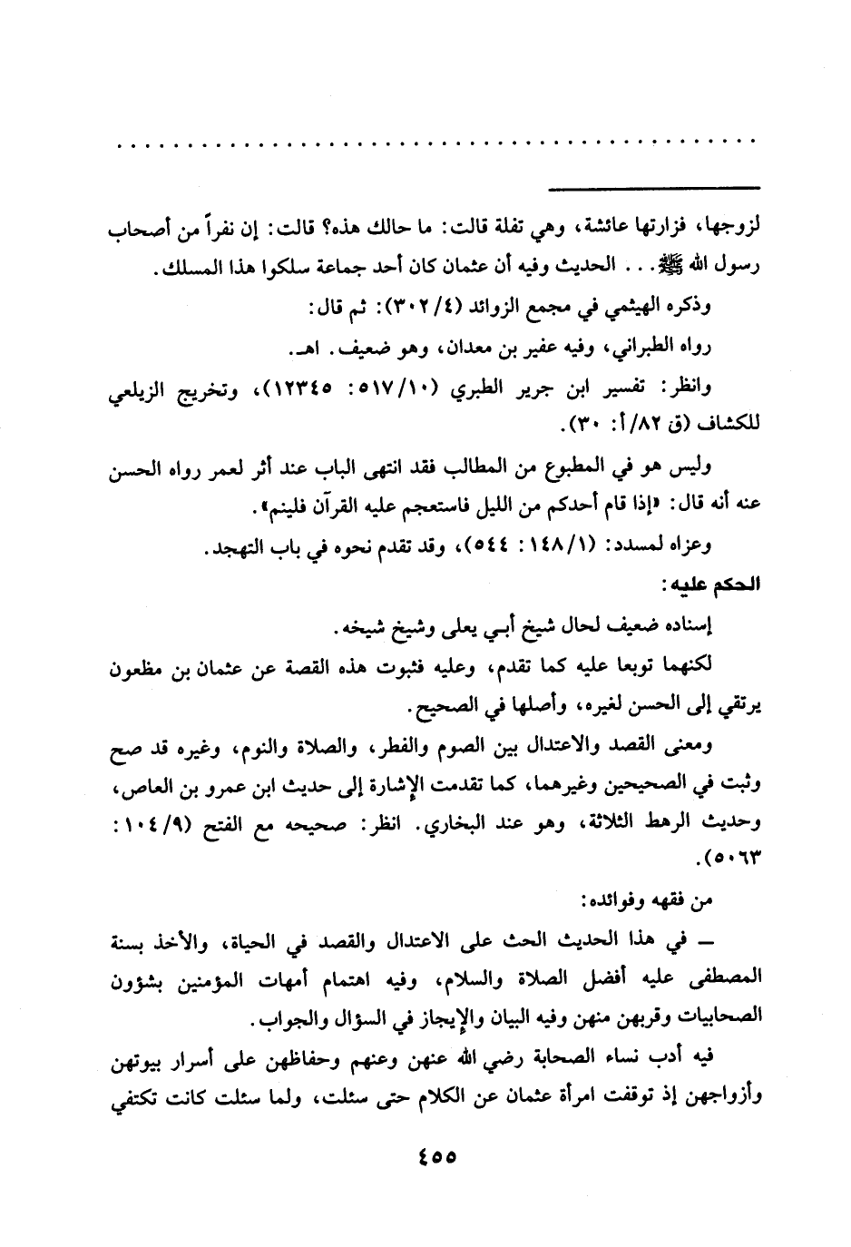 = لزوجها، فزارتها عائشة، وهي تفلة قالت: ما حالك هذه؟ قالت: إن نفرًا مِنْ أَصْحَابِ رَسُولِ اللَّهِ -صَلَّى اللَّهُ عَلَيْهِ وسلم- ... الحديث وفيه أن عثمان كان أحد جماعة سلكوا هذا المسلك. وذكره الهيثمي في مجمع الزوائد (4/ 302): ثم قال: