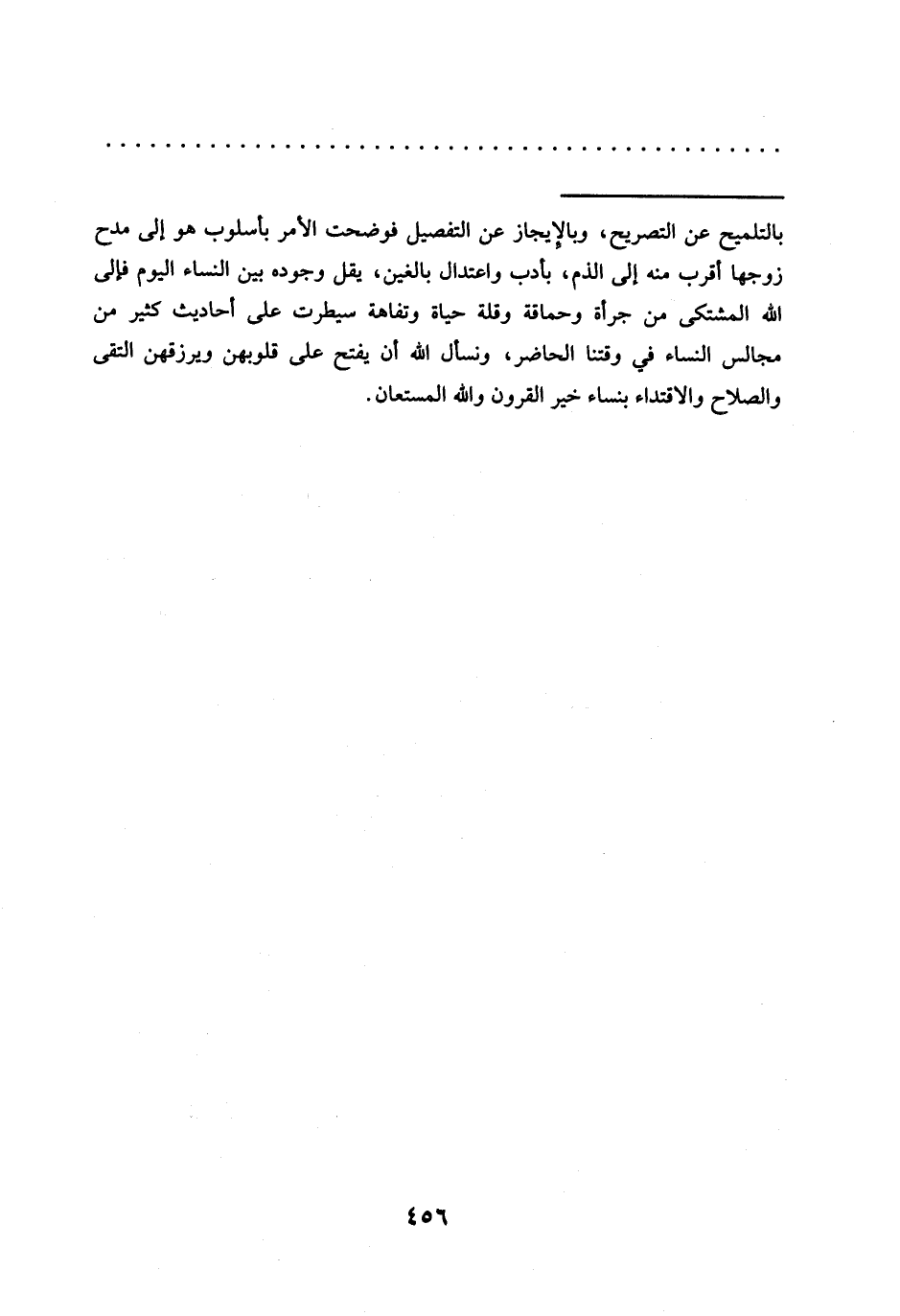= بالتلميح عن التصريح، وبالإِيجاز عن التفصيل فوضحت الأمر بأسلوب هو إلى مدح زوجها أقرب منه إلى الذم، بأدب واعتدال بالغين، يقل وجوده بين النساء اليوم فإلى الله المشتكى من جرأة وحماقة وقلة حياء وتفاهة سيطرت على أحاديث كثير من مجالس النساء في وقتنا الحاضر، ونسأل الله أن يفتح على قلوبهن ويرزقهن التقى والصلاح والاقتداء بنساء خير القرون والله المستعان.