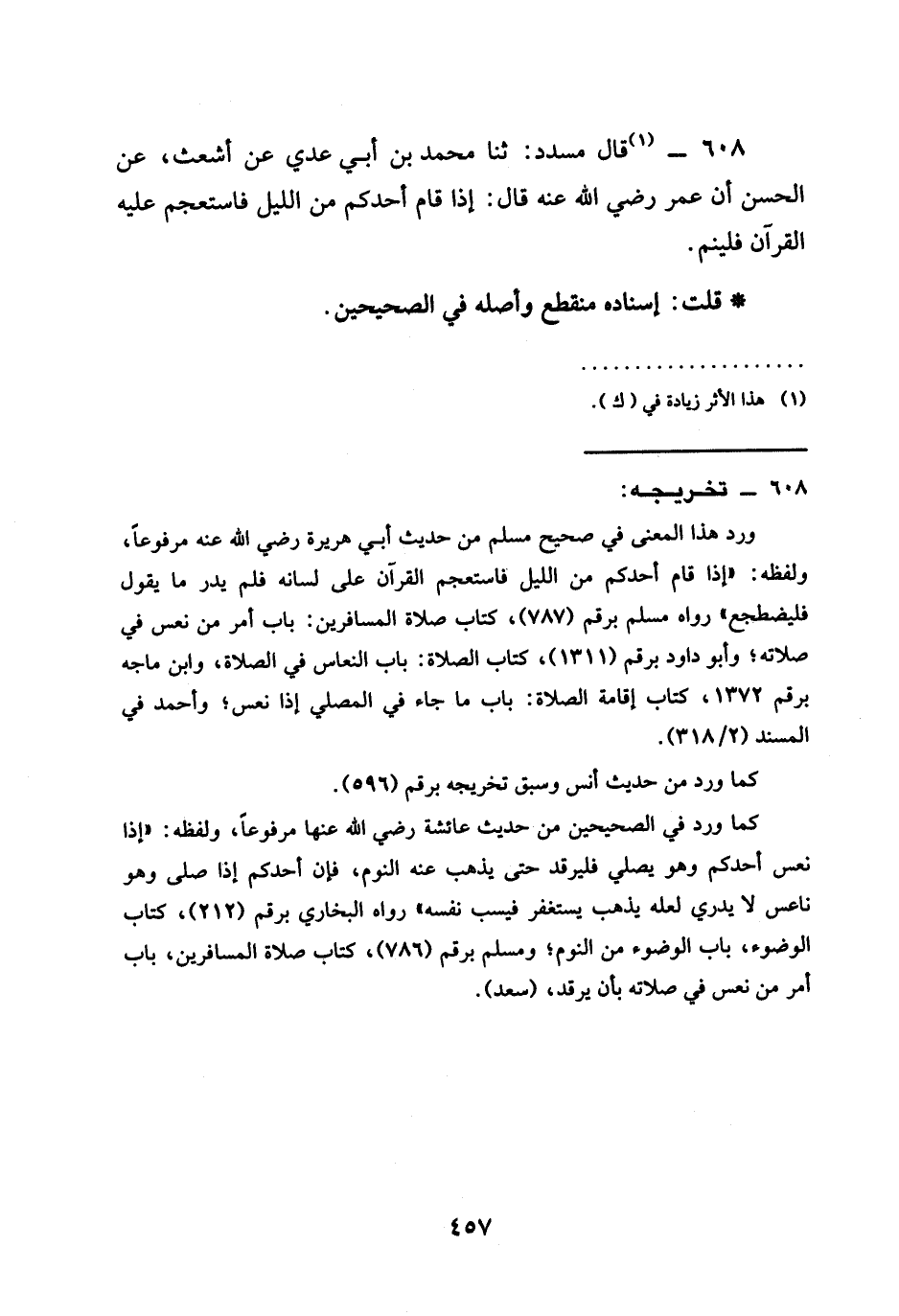 608 - قَالَ مُسَدَّدٌ ثنا مُحَمَّدُ بْنُ أَبِي عَدِيٍّ عَنْ أَشْعَثَ عَنِ الْحَسَنِ أَنَّ عُمَرَ رَضِيَ اللَّهُ عَنْهُ قَالَ §إِذَا قَامَ أَحَدُكُمْ مِنَ اللَّيْلِ فَاسْتَعْجَمَ عَلَيْهِ الْقُرْآنُ فَلْيَنَمْ