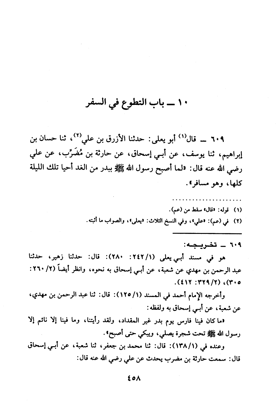 609 - قَالَ أَبُو يَعْلَى حَدَّثَنَا الْأَزْرَقُ بْنُ عَلِيٍّ ثنا حَسَّانُ بْنُ إِبْرَاهِيمَ ثنا يُوسُفُ عَنْ أَبِي إِسْحَاقَ عَنْ حَارِثَةَ بْنِ مُضَرِّبٍ عَنْ عَلِيٍّ رَضِيَ اللَّهُ عَنْهُ قَالَ " §لَمَّا أَصْبَحَ رَسُولُ اللَّهِ صَلَّى اللَّهُ عَلَيْهِ وَسَلَّمَ بِبَدْرٍ مِنَ الْغَدِ أَحْيَا تِلْكَ اللَّيْلَةَ كُلَّهَا وَهُوَ مُسَافِرٌ "