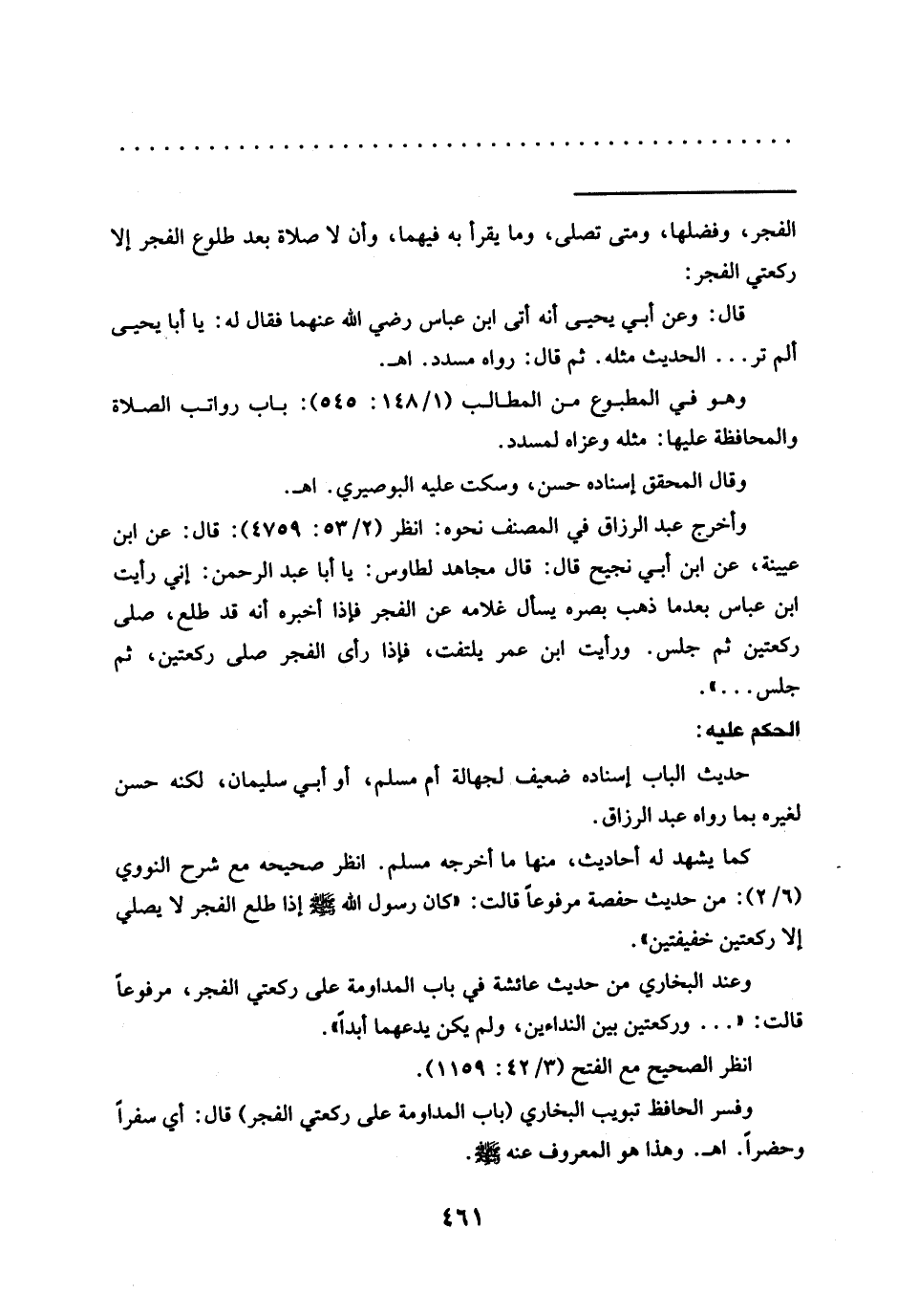 وأخرج عبد الرزاق في المصنف نحوه: انظر (2/ 53: 4759): قال: عن ابن عيينة، عن ابن أبي نجيح قال: قال مجاهد لطاوس: يا أبا عبد الرحمن: إني رأيت ابن عباس بعد ما ذهب بصره يسأل غلامه عن الفجر فإِذا أخبره أنه قد طلع، صلى ركعتين ثم جلس. ورأيت ابن عمر يلتفت، فإِذا رأى الفجر صلى ركعتين، ثم جلس ... ".
