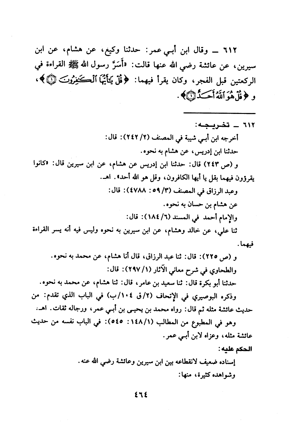 612 - وَقَالَ ابْنُ أَبِي عُمَرَ حَدَّثَنَا وَكِيعٌ عَنْ هِشَامٍ عَنِ ابْنِ سِيرِينَ عَنْ عَائِشَةَ رَضِيَ اللَّهُ عَنْهَا قَالَتْ " §أَسَرَّ رَسُولُ اللَّهِ صَلَّى اللَّهُ عَلَيْهِ وَسَلَّمَ الْقِرَاءَةَ فِي الرَّكْعَتَيْنِ قَبْلَ الْفَجْرِ وَكَانَ يَقْرَأُ فِيهِمَا {قُلْ يَا أَيُّهَا الْكَافِرُونَ} وَ {قُلْ هُوَ اللَّهُ أَحَدٌ}