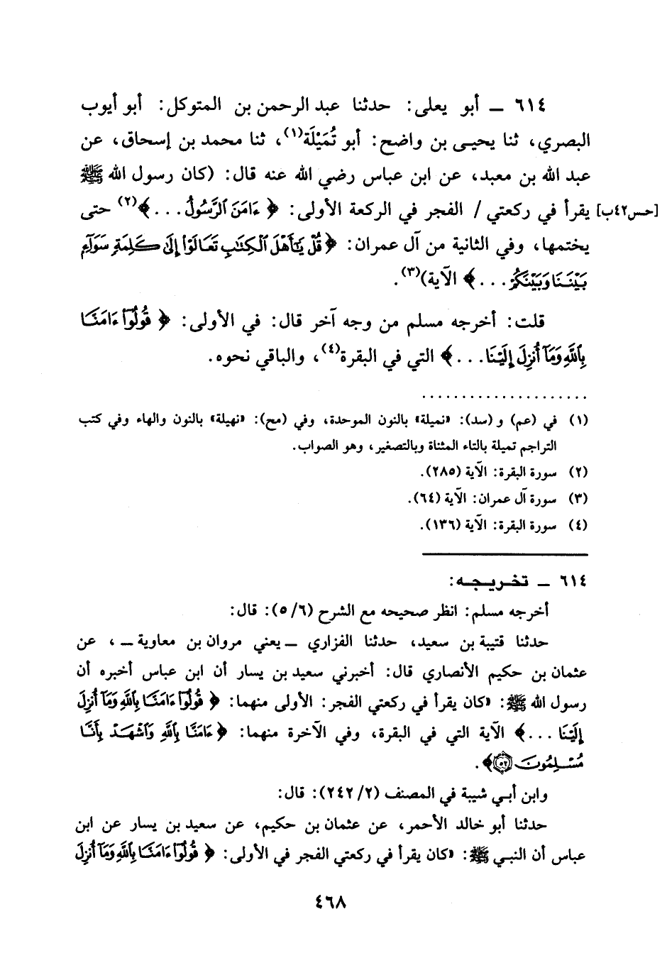 614 - أَبُو يَعْلَى حَدَّثَنَا عَبْدُ الرَّحْمَنِ بْنُ الْمُتَوَكِّلِ أَبُو أَيُّوبَ الْبَصْرِيُّ ثنا يَحْيَى بْنُ وَاضِحٍ أَبُو تُمَيْلَةَ ثنا مُحَمَّدُ بْنُ إِسْحَاقَ عَنْ عَبْدِ اللَّهِ بْنِ مَعْبَدٍ عَنِ ابْنِ عَبَّاسٍ رَضِيَ اللَّهُ عَنْهُ قَالَ (كَانَ رَسُولُ اللَّهِ صَلَّى اللَّهُ عَلَيْهِ وَسَلَّمَ §يَقْرَأُ فِي رَكْعَتَيِ الْفَجْرِ فِي الرَّكْعَةِ الْأُولَى {آمَنَ الرَّسُولُ} حَتَّى يَخْتِمَهَا وَفِي الثَّانِيَةِ مِنْ آلِ عِمْرَانَ {قُلْ يَا أَهْلَ الْكِتَابِ تَعَالَوْا إِلَى كَلِمَةٍ سَوَاءٍ بَيْنَنَا وَبَيْنَكُمْ} الْآيَةَ قُلْتُ أَخْرَجَهُ مُسْلِمٌ مِنْ وَجْهٍ آخَرَ قَالَ فِي الْأُولَى {قُولُوا آمَنَّا بِاللَّهِ وَمَا أُنْزِلَ إِلَيْنَا} الَّتِي فِي الْبَقَرَةِ وَالبَاقِي نَحْوَهُ -[470]-