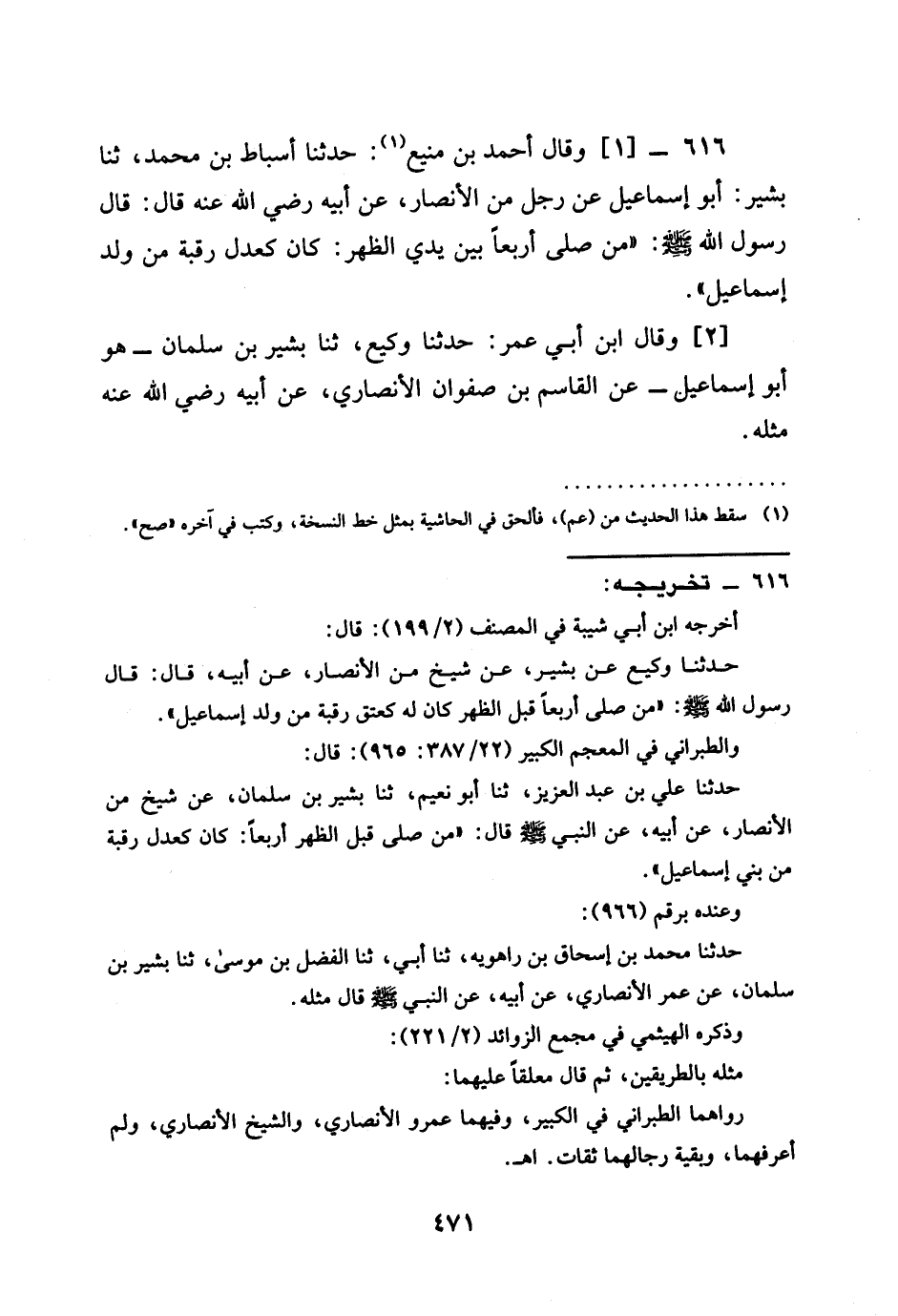616 -[1] وَقَالَ أَحْمَدُ بْنُ مَنِيعٍ حَدَّثَنَا أَسْبَاطُ بْنُ مُحَمَّدٍ ثنا بَشِيرٌ أَبُو إِسْمَاعِيلَ عَنْ رَجُلٍ مِنَ الْأَنْصَارِ عَنْ أَبِيهِ رَضِيَ اللَّهُ عَنْه قَالَ قَالَ رَسُولُ اللَّهِ صَلَّى اللَّهُ عَلَيْهِ وَسَلَّمَ " §مَنْ صَلَّى أَرْبَعًا بَيْنَ يَدَيِ الظُّهْرِ كَانَ كَعَدْلِ رَقَبَةٍ مِنْ وَلَدِ إِسْمَاعِيلَ "