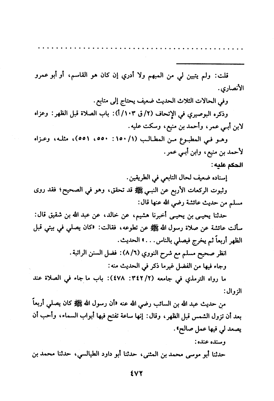 سألت عائشة عَنْ صَلَاةِ رَسُولِ اللَّهِ - صَلَّى اللَّهُ عَلَيْهِ وسلم - عن تطوعه، فقالت: "كان يصلي في بيتي قبل الظهر أربعًا ثم يخرج فيصلي بالناس ... " الحديث.