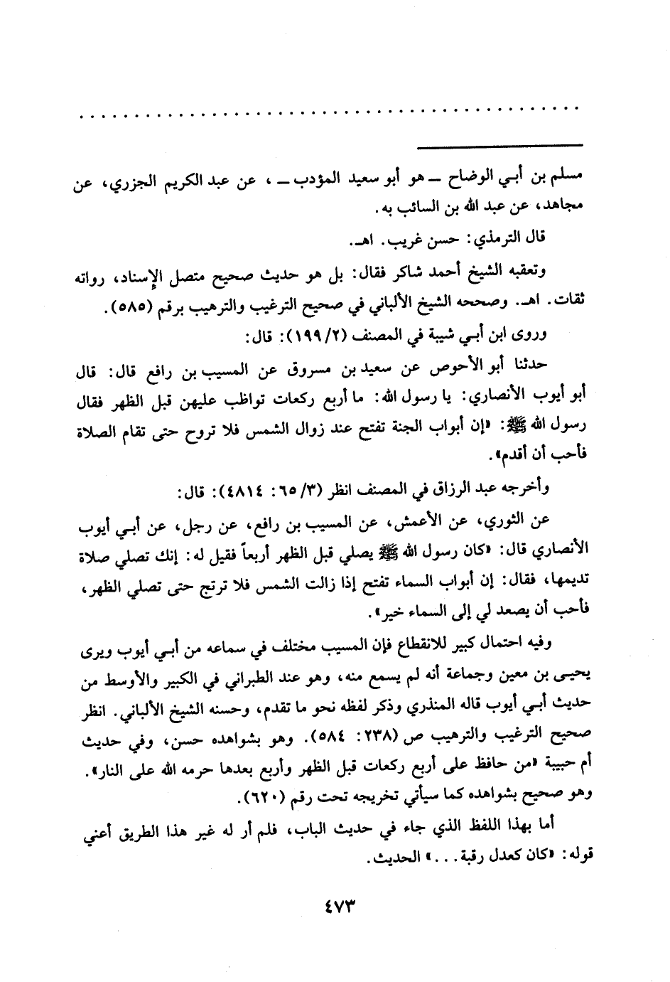 وفيه احتمال كبير للانقطاع فإِن المسيب مختلف في سماعه من أبي أيوب ويرى يحيى بن معين وجماعة أنه لم يسمع منه، وهو عند الطبراني في الكبير والأوسط من حديث أبي أيوب قاله المنذري وذكر لفظه نحو ما تقدم، وحسنه الشيخ الألباني. انظر صحيح الترغيب والترهيب ص (238: 584). وهو بشواهده حسن، وفي حديث أم حبيبة "من حافظ على أربع ركعات قبل الظهر وأربع بعدها حرمه الله على النار".