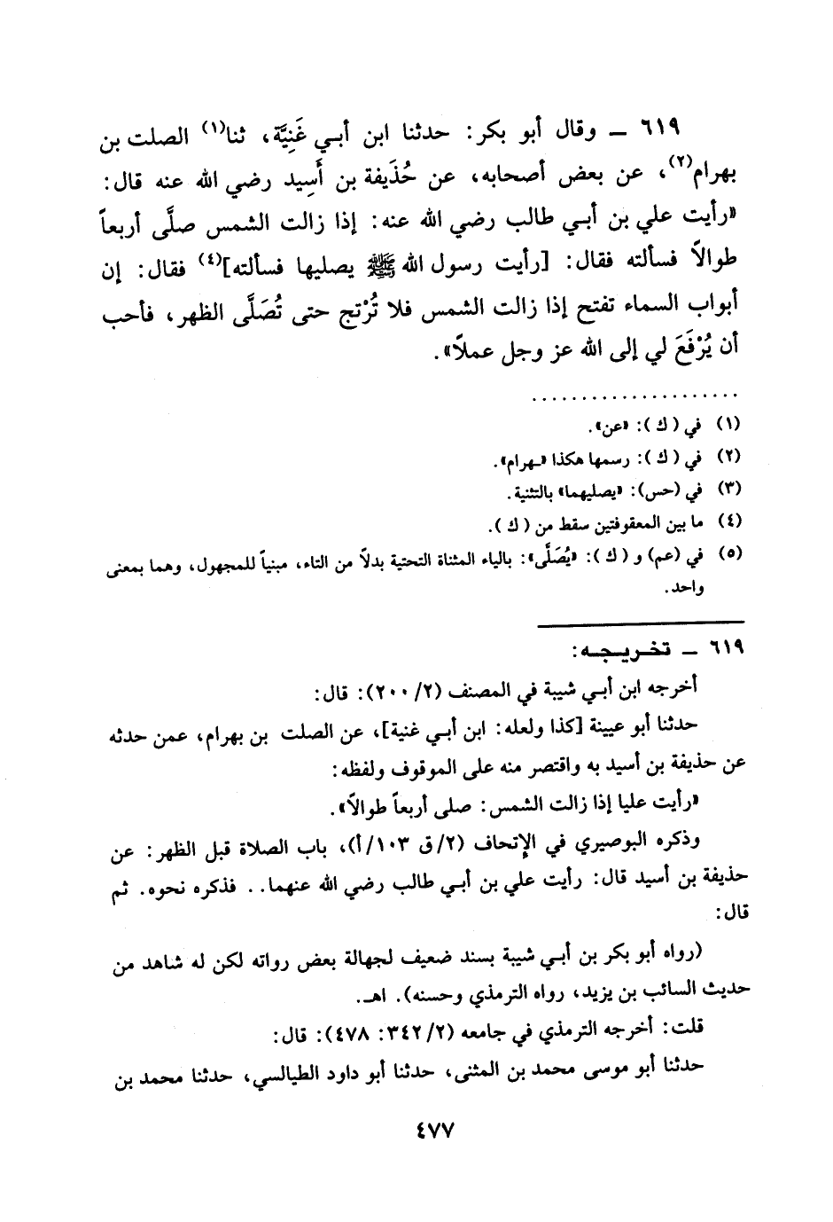 619 - وَقَالَ أَبُو بَكْرٍ حَدَّثَنَا ابْنُ أَبِي غَنِيَّةَ ثنا الصَّلْتِ بْنِ بَهْرَامَ عَنْ بَعْضِ أَصْحَابِهِ عَنْ حُذَيْفَةَ بْنِ أَسِيدٍ رَضِيَ اللَّهُ عَنْه قَالَ " رَأَيْتُ عَلِيَّ بْنَ أَبِي طَالِبٍ رَضِيَ اللَّهُ عَنْه إِذَا زَالَتِ الشَّمْسُ صَلَّى أَرْبَعًا طُوَالًا فَسَأَلْتُهُ فَقَالَ رَأَيْتُ رَسُولَ اللَّهِ يُصَلِّيْهَا فَسَأَلْتُهُ فَقَالَ إِنَّ §أَبْوَابَ السَّمَاءِ تُفَتَّحُ إِذَا زَالَتِ الشَّمْسُ فَلَا تَرْتَجُ حَتَّى تُصَلِّي الظُّهْرَ فَأُحِبُّ أَنْ يُرْفَعَ لِي إِلَى اللَّهِ عز وجل عملا "