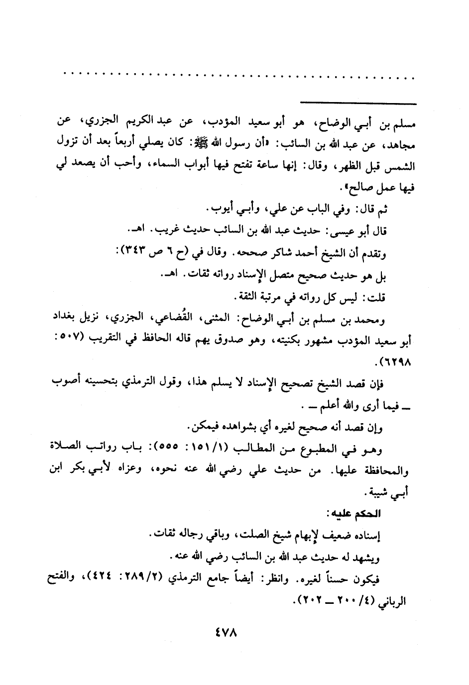 = مسلم بن أبي الوضاح، هو أبو سعيد المؤدب، عن عبد الكريم الجزري، عن مجاهد، عن عبد الله بن السائب: "أن رسول الله -صلى الله عليه وسلم-: كان يصلي أربعًا بعد أن تزول الشمس قبل الظهر، وقال: إنها ساعة تفتح فيها أبواب السماء، وأحب أن يصعد لي فيها عمل صالح".