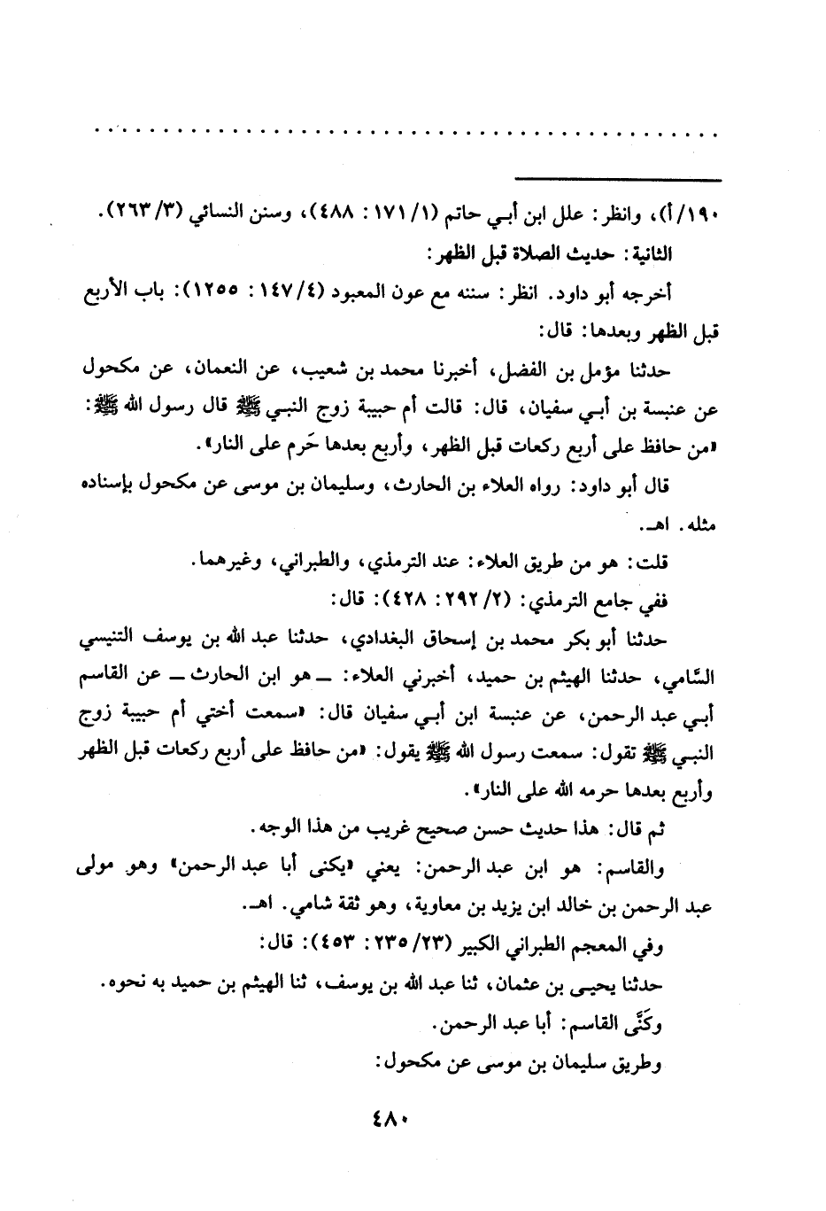 حدثنا أبو بكر محمد بن إسحاق البغدادي، حدثنا عبد الله بن يوسف التنيسي الشامي، حدثنا الهيثم بن حميد، أخبرني العلاء: -هو ابن الحارث- عن القاسم أبي عبد الرحمن، عن عنبسة ابن أبي سفيان قال: "سمعت أختي أم حبيبة زَوْجَ النَّبِيِّ -صَلَّى اللَّهُ عَلَيْهِ وَسَلَّمَ- تَقُولُ: سَمِعْتُ رَسُولَ اللَّهِ - صَلَّى اللَّهُ عَلَيْهِ وسلم - يقول: "من حافظ على أربع ركعات قبل الظهر وأربع بعدها حرمه الله على النار".