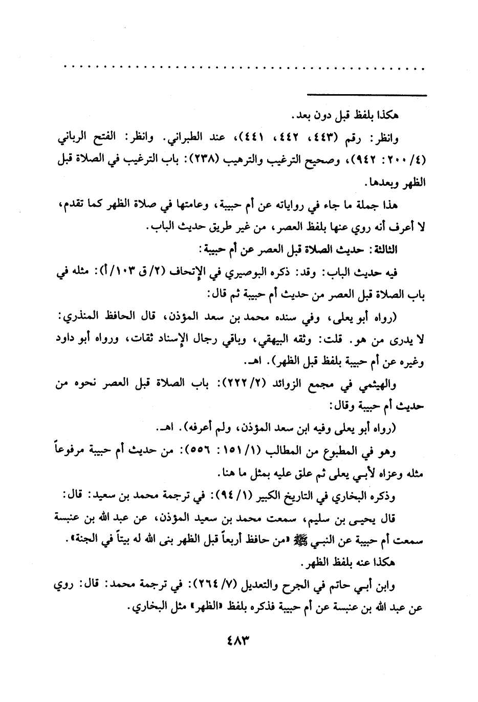 وابن أبي حاتم في الجرح والتعديل (7/ 264): في ترجمة محمد: قال: روي عن عبد الله بن عنبسة عن أم حبيبة فذكره بلفظ "الظهر" مثل البخاري.=