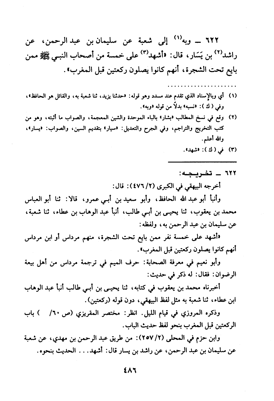 622 - وَبِهِ إِلَى شُعْبَةَ عَنْ سُلَيْمَانَ بْنِ عَبْدِ الرَّحْمَنِ عَنْ رَاشِدِ بْنِ يَسَارٍ قَالَ أَشْهَدُ عَلَى خَمْسَةٍ مِنْ أَصْحَابِ النَّبِيِّ صَلَّى اللَّهُ عَلَيْهِ وَسَلَّمَ مِمَّنْ بَايَعَ تَحْتَ الشَّجَرَةِ أَنَّهُمْ كَانُوا §يُصَلُّونَ رَكْعَتَيْنِ قَبْلَ الْمَغْرِبِ