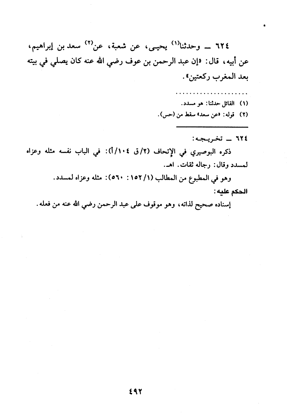 624 - وَحَدَّثَنَا يَحْيَى عَنْ شُعْبَةَ عَنْ سَعْدِ بْنِ إِبْرَاهِيمَ عَنْ أَبِيهِ قَالَ " إِنَّ عَبْدَ الرَّحْمَنِ بْنَ عَوْفٍ رَضِيَ اللَّهُ عَنْه §كَانَ يُصَلِّي فِي بَيْتِهِ بَعْدَ الْمَغْرِبِ رَكْعَتَيْنِ