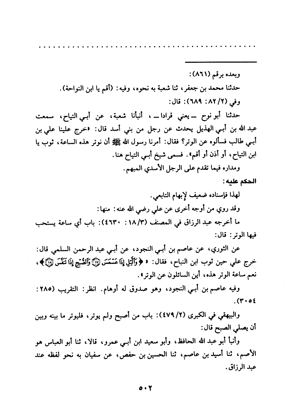 حدثنا أبو نوح -يعني قرادا-، أنبأنا شعبة، عن أبي التياح، سمعت عبد الله بن أبي الهذيل يحدث عَنْ رَجُلٍ مِنْ بَنِي أَسَدٍ قَالَ: "خَرَجَ علينا علي بن أبي طالب فسألوه عن الوتر؟ فقال: أَمَرَنَا رَسُولُ اللَّهِ - صَلَّى اللَّهُ عَلَيْهِ وَسَلَّمَ - أن نوتر هذه الساعة، ثوب يا ابن التياح، أو أذن أو أقم". فسمى شيخ أبي التياح هنا.