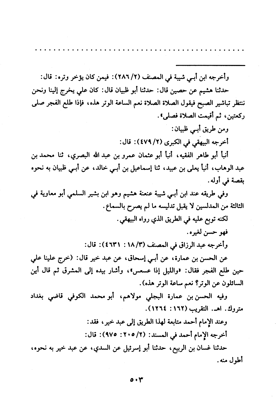 عن الحسن بن عمارة، عن أبي إسحاق، عن عبد خير قال: (خرج علينا علي حين طلع الفجر فقال: "والليل إذا عسعس"، وأشار بيده إلى المشرق ثم قال أين السائلون عن الوتر؟ نعم ساعة الوتر هذه).