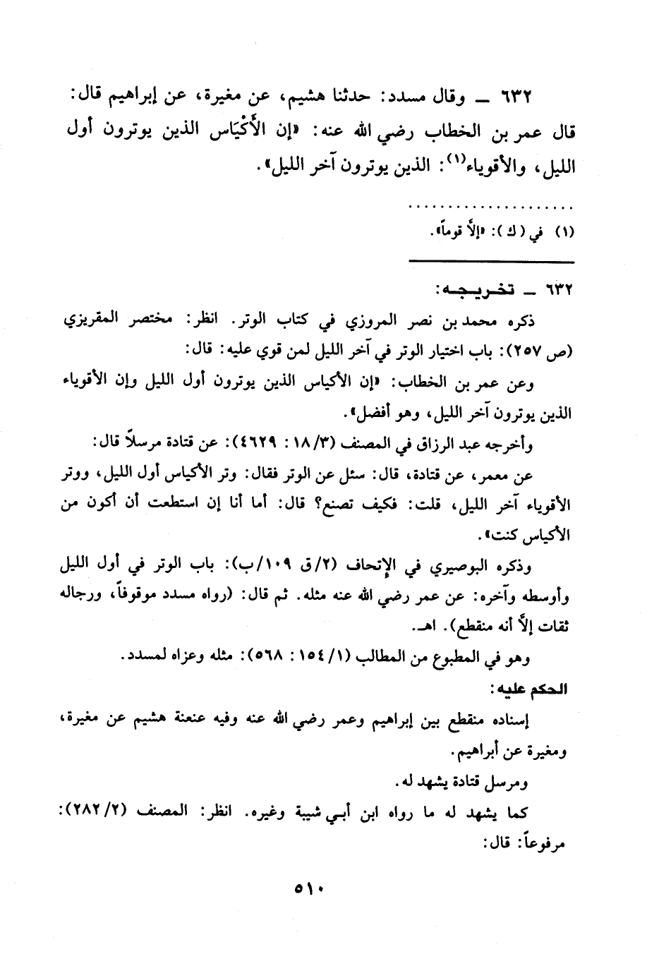632 - وَقَالَ مُسَدَّدٌ حَدَّثَنَا هُشَيْمٌ عَنْ مُغِيرَةَ عَنْ إِبْرَاهِيمَ قَالَ قَالَ عُمَرُ بْنُ الْخَطَّابِ رَضِيَ اللَّهُ عَنْهُ " إِنَّ §الْأَكْيَاسَ الَّذِينَ يُوتِرُونَ أَوَّلَ اللَّيْلِ وَالْأَقْوِيَاءَ الَّذِينَ يُوتِرُونَ آخِرَ اللَّيْلِ "