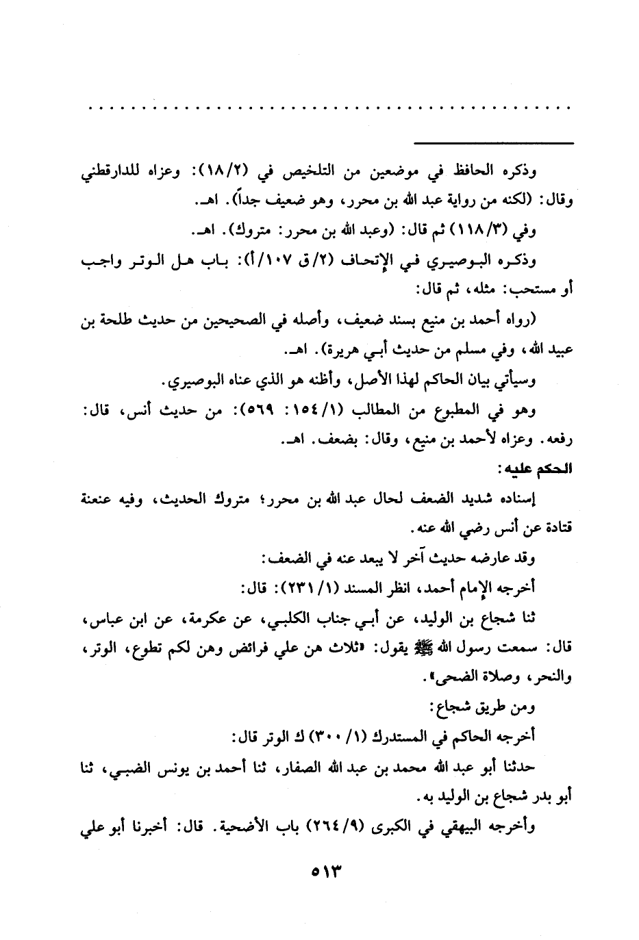 = وذكره الحافظ في موضعين من التلخيص في (2/ 18): وعزاه للدارقطني وقال: (لكنه من رواية عبد الله بن محرر، وهو ضعيف جدًا). اهـ.