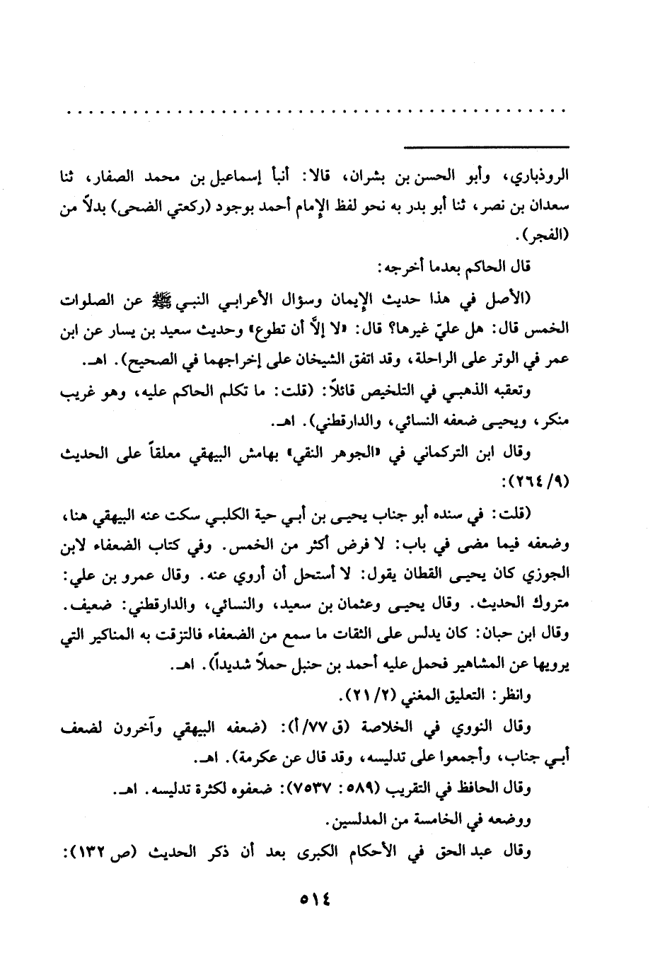 (قلت: في سنده أبو جناب يحيى بن أبي حية الكلبي سكت عنه البيهقي هنا، وضعفه فيما مضى في باب: لا فرض أكثر من الخمس. وفي كتاب الضعفاء لابن الجوزي كان يحيى القطان يقول: لا أستحل أن أروي عنه. وقال عمرو بن علي: