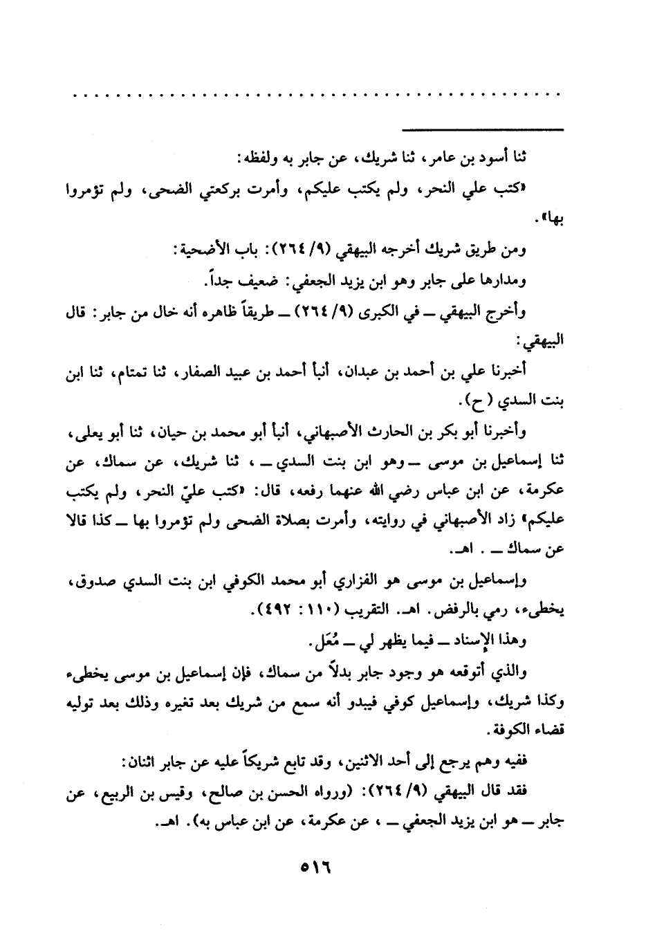 وأخبرنا أبو بكر بن الحارث الأصبهاني، أنبأ أبو محمد بن حيان، ثنا أبو يعلى، ثنا إسماعيل بن موسى -وهو ابن بنت السدي-، ثنا شَرِيكٌ، عَنْ سِمَاكٍ، عَنْ عِكْرِمَةَ، عَنِ ابْنِ عَبَّاسٍ رضي الله عنهما رفعه، قال: "كتب عليّ النحر، ولم يكتب عليكم" زاد الأصبهاني في روايته، وأمرت بصلاة الضحى ولم تؤمروا بها -كذا قالا عن سماك-. اهـ.