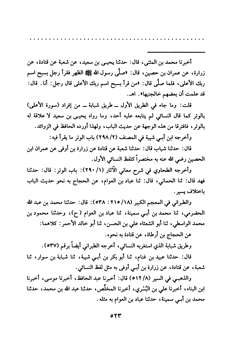 قلت: وما جاء في الطريق الأول -طريق شبابة- من إفراد (سورة الأعلى) بالوتر كما قال النسائي لم يتابعه عليه أحد، وما رواه يحيى بن سعيد لا علاقة له بالوتر، فافترقا من هذه الوجهة عن حديث الباب، ولهذا أورده الحافظ في الزوائد.