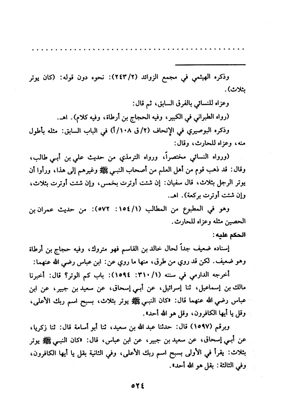 وبرقم (1597) قال: حدثثا عبد الله بن سعيد، ثنا أبو أسامة قال: ثنا زكريا، عَنْ أَبِي إِسْحَاقَ، عَنْ سَعِيدِ بْنِ جُبَيْرٍ، عَنِ ابْنِ عَبَّاسٍ، قَالَ: "كَانَ النَّبِيُّ -صَلَّى اللَّهُ عَلَيْهِ وَسَلَّمَ- يوتر بثلاث: يقرأ في الْأُولَى بِسَبِّحِ اسْمَ رَبِّكَ الْأَعْلَى، وَفِي الثَّانِيَةِ بِقُلْ يَا أَيُّهَا الْكَافِرُونَ، وَفِي الثَّالِثَةِ: بِقُلْ هو الله أحد".=