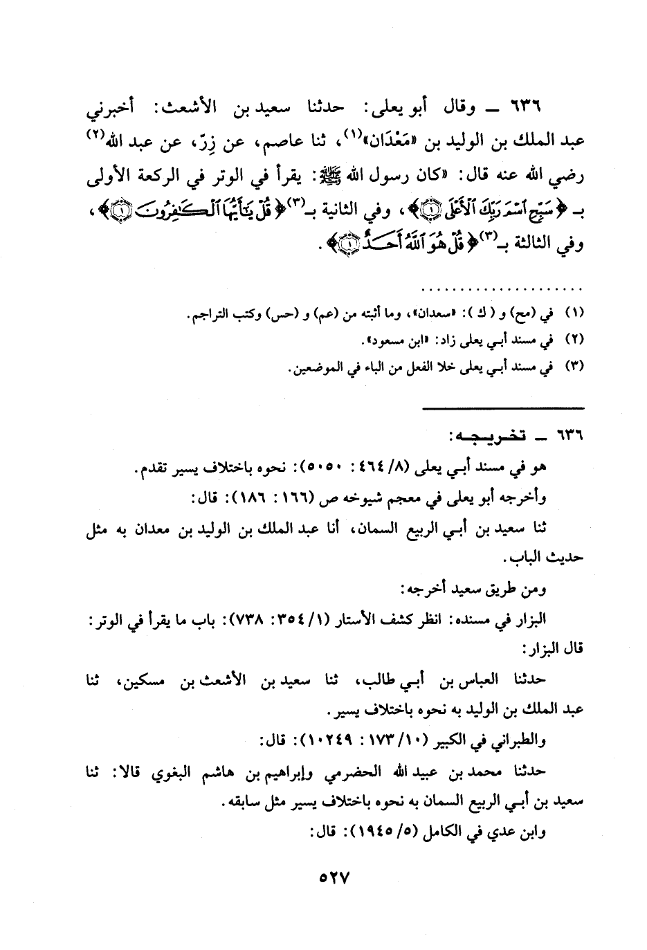 636 - وَقَالَ أَبُو يَعْلَى حَدَّثَنَا سَعِيدُ بْنُ الْأَشْعَثِ أَخْبَرَنِي عَبْدُ الْمَلِكِ بْنُ الْوَلِيدِ بْنِ مَعْدَانَ ثنا عَاصِمٌ عَنْ زِرٍّ عَنْ عَبْدِ اللَّهِ رَضِيَ اللَّهُ عَنْهُ قَالَ " كَانَ رَسُولُ اللَّهِ صَلَّى اللَّهُ عَلَيْهِ وَسَلَّمَ §يَقْرَأُ فِي الْوِتْرِ فِي الركعة الأولى ب {سبح اسْمَ رَبِّكَ الْأَعْلَى} وفي الثانية ب {قل يَا أَيُّهَا الْكَافِرُونَ} وفي الثالثة ب {قل هُوَ اللَّهُ أَحَدٌ}