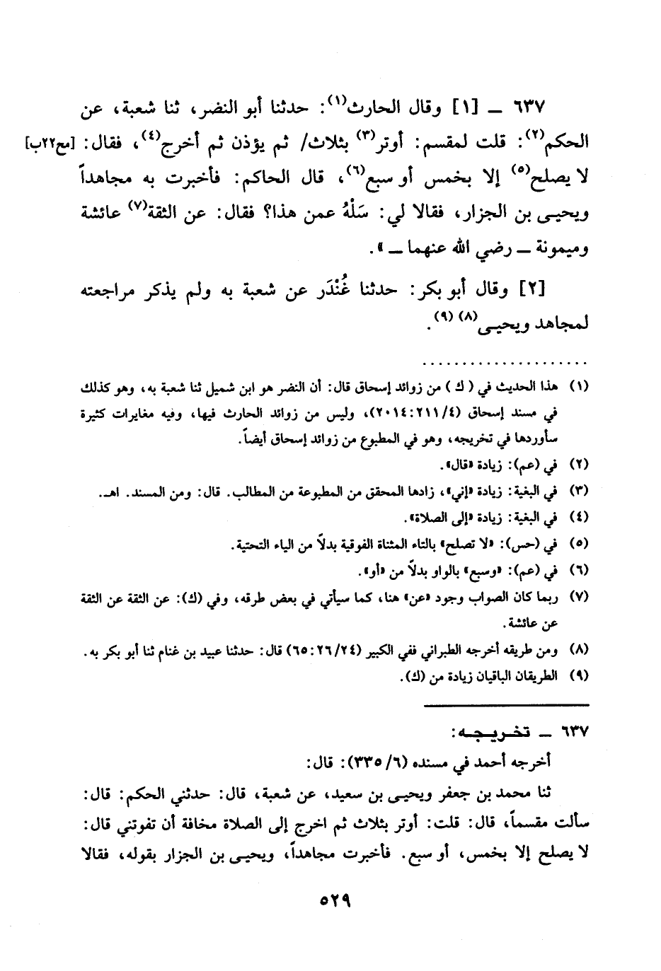 637 -[1] وَقَالَ الحارث حدثنا أبو النَّضْرُ ثنا شُعْبَةُ عَنِ الْحَكَمِ قُلْتُ لِمِقْسَمٍ أُوتِرُ بِثَلَاثٍ ثُمَّ يُؤَذِّنُ ثُمَّ أَخْرُجُ فَقَالَ §لَا يَصْلُحُ إِلَّا بَخَمْسٍ أَوْ سَبْعٍ قَالَ الحاكم فَأَخْبَرْتُ بِهِ مُجَاهِدًا وَيَحْيَى بْنَ الْجَزَّارِ فَقَالَا لِي سَلْهُ عَمَّنْ هَذَا فَقَالَ عَنِ الثِّقَةِ عائشة وميمونة رضي الله عنهما