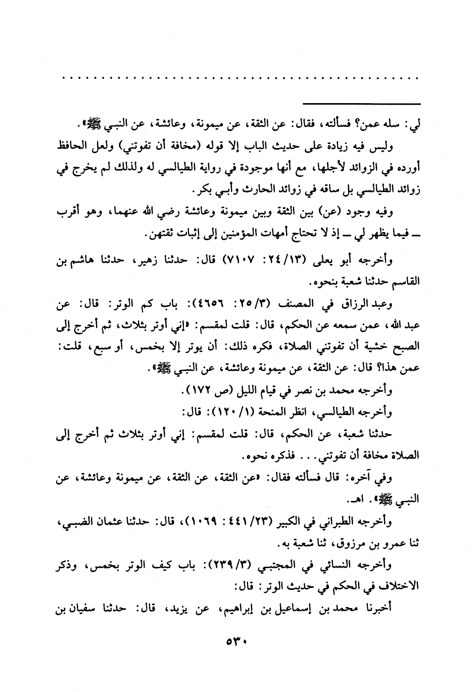 وفيه وجود (عن) بين الثقة وبين ميمونة وعائشة رضي الله عنهما، وهو أقرب -فيما يظهر لي- إذ لا تحتاج أمهات المؤمنين إلى إثبات ثقتهن.