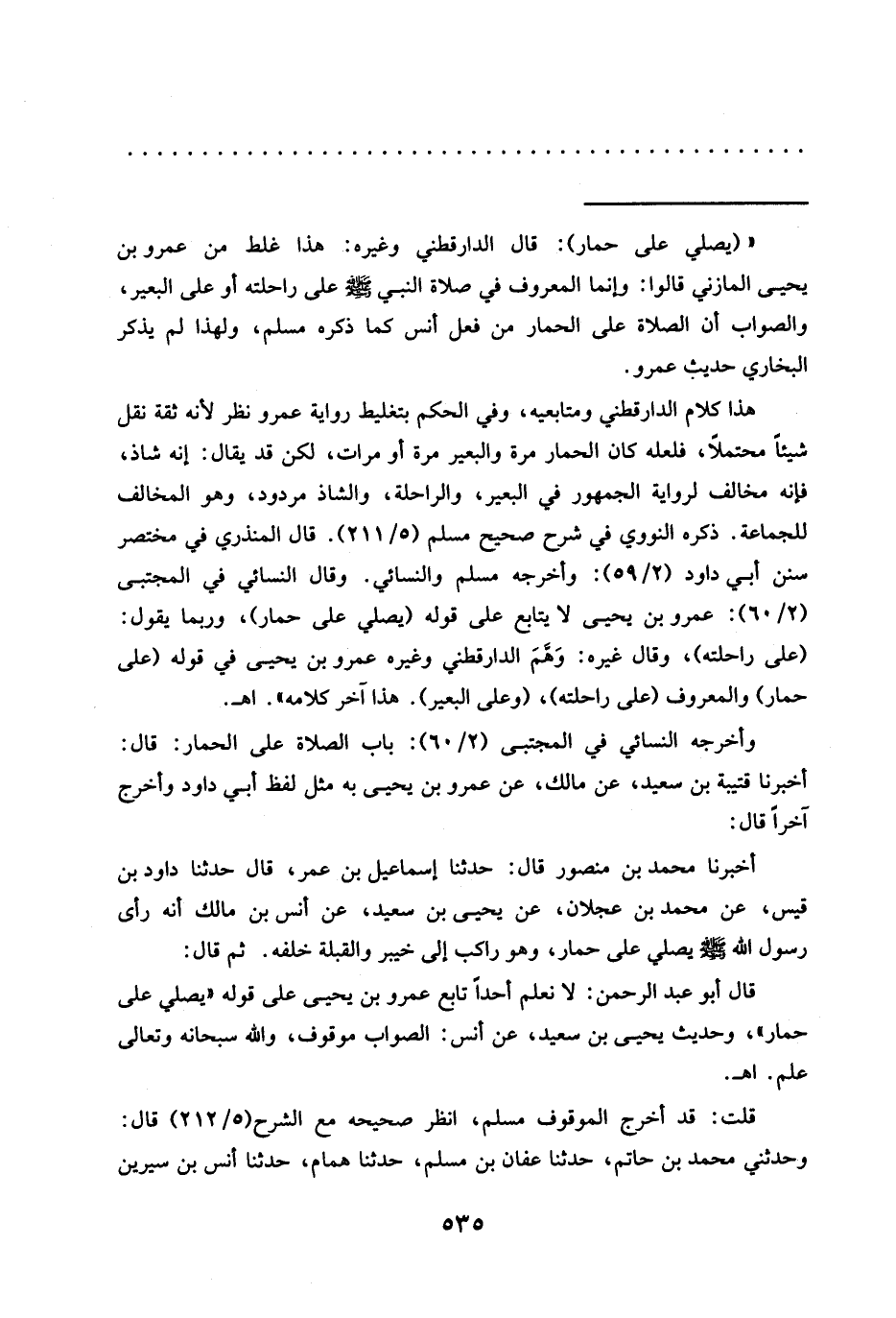 (على راحلته)، وقال غيره: وَهَّمَ الدارقطني وغيره عمرو بن يحيى في قوله (على حمار) والمعروف (على راحلته)، (وعلى البعير). هذا آخر كلامه". اهـ.