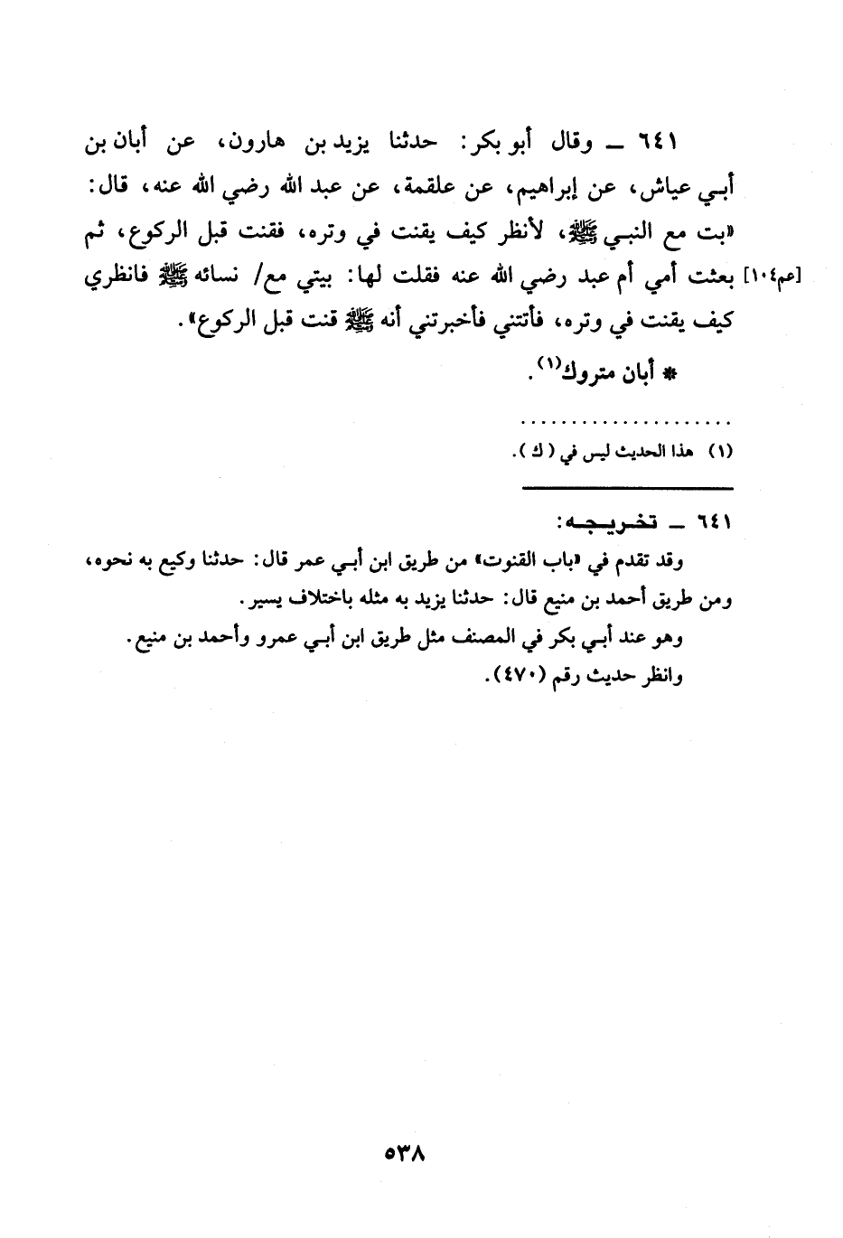641 - وَقَالَ أَبُو بَكْرٍ حَدَّثَنَا يَزِيدُ بْنُ هَارُونَ عَنْ أَبَانَ بْنِ أَبِي عَيَّاشٍ عَنْ إِبْرَاهِيمَ عَنْ عَلْقَمَةَ عَنْ عَبْدِ اللَّهِ رَضِيَ اللَّهُ عَنْهُ قَالَ " §بِتُّ مَعَ النَّبِيِّ صَلَّى اللَّهُ عَلَيْهِ وَسَلَّمَ لِأَنْظُرَ كَيْفَ يَقْنُتُ فِي وِتْرِهِ فَقَنَتَ قَبْلَ الرُّكُوعِ ثُمَّ بَعَثْتُ أُمِّي أُمَّ عَبْدٍ رَضِيَ اللَّهُ عَنْهُ فَقُلْتُ لَهَا بَيِّتِي مَعَ نِسَائِهِ صَلَّى اللَّهُ عَلَيْهِ وَسَلَّمَ فَانْظُرِي كَيْفَ يَقْنُتُ فِي وِتْرِهِ فَأَتَتْنِي فَأَخْبَرَتْنِي أَنَّهُ صَلَّى اللَّهُ عَلَيْهِ وَسَلَّمَ قَنَتَ قَبْلَ الرُّكُوعِ