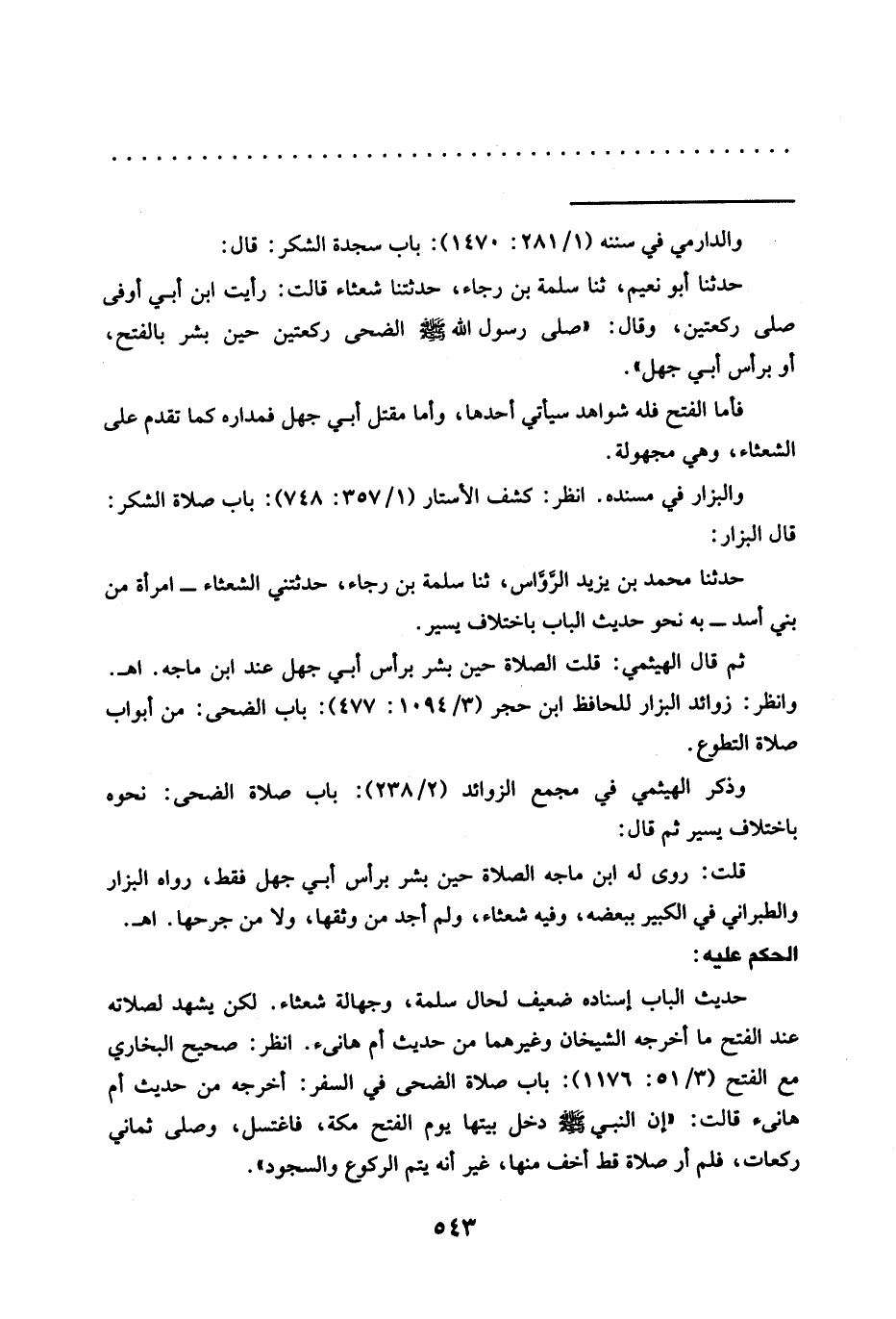 حدثنا أبو نعيم، ثنا سَلَمَةُ بْنُ رَجَاءٍ، حَدَّثَتْنَا شَعْثَاءُ قَالَتْ: رأيت ابن أبي أوفى صلى ركعتين، وقال: "صَلَّى رَسُولُ اللَّهِ -صَلَّى اللَّهُ عَلَيْهِ وَسَلَّمَ- الضحى ركعتين حين بشر بالفتح، أو برأس أبي جهل".