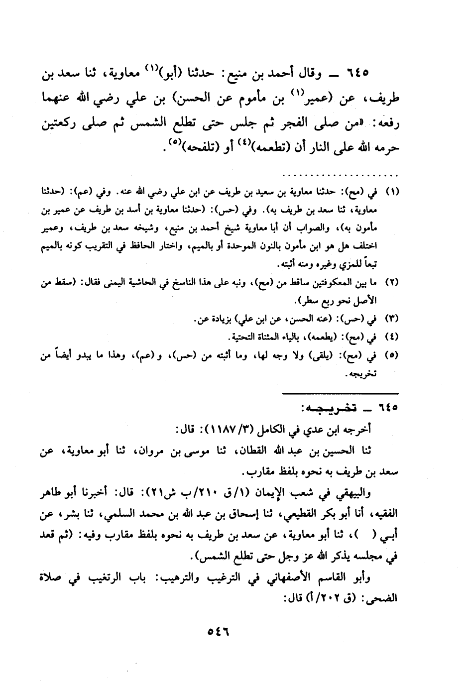 645 - وَقَالَ أَحْمَدُ بْنُ مَنِيعٍ حَدَّثَنَا أَبُو مُعَاوِيَةَ ثنا سَعْدُ بْنُ طَرِيفٍ عَنْ عُمَيْرِ بْنِ مَأْمُومٍ عَنِ الْحَسَنِ بْنِ عَلِيٍّ رَضِيَ اللَّهُ عَنْهُمَا رَفَعَهُ " §مَنْ صَلَّى الْفَجْرَ ثُمَّ جَلَسَ حَتَّى تَطْلُعَ الشَّمْسُ ثُمَّ صَلَّى رَكْعَتَيْنِ حَرَّمَهُ اللَّهُ عَلَى النَّارِ أَنْ تَطْعَمَهُ أَوْ تَلْفَحَهُ