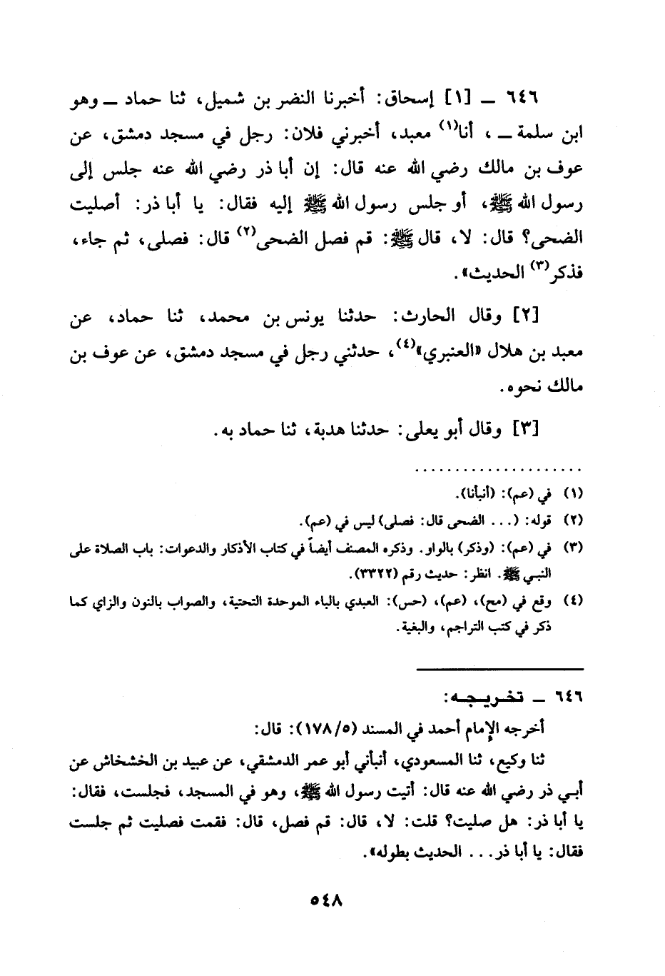 646 -[1] إِسْحَاقُ أَخْبَرَنَا النَّضْرُ بْنُ شُمَيْلٍ ثنا حماد وهوا بن سَلَمَةَ أنا مَعْبَدٌ أَخْبَرَنِي فُلَانٌ رَجُلٌ فِي مَسْجِدِ دِمَشْقَ عَنْ عَوْفِ بْنِ مَالِكٍ رَضِيَ اللَّهُ عَنْهُ قَالَ إِنَّ أَبَا ذَرٍّ رَضِيَ اللَّهُ عَنْهُ جَلَسَ إِلَى رَسُولِ اللَّهِ صَلَّى اللَّهُ عَلَيْهِ وَسَلَّمَ أَوْ جَلَسَ رَسُولُ اللَّهِ صَلَّى اللَّهُ عَلَيْهِ وَسَلَّمَ إِلَيْهِ فَقَالَ يَا أَبَا ذَرٍّ أَصَلَّيْتَ الضُّحَى قَالَ لَا قَالَ صَلَّى اللَّهُ عَلَيْهِ وَسَلَّمَ §قُمْ فَصَلِّ الضُّحَى قَالَ فَصَلَّى ثُمَّ جَاءَ فَذَكَرَ الْحَدِيثَ "