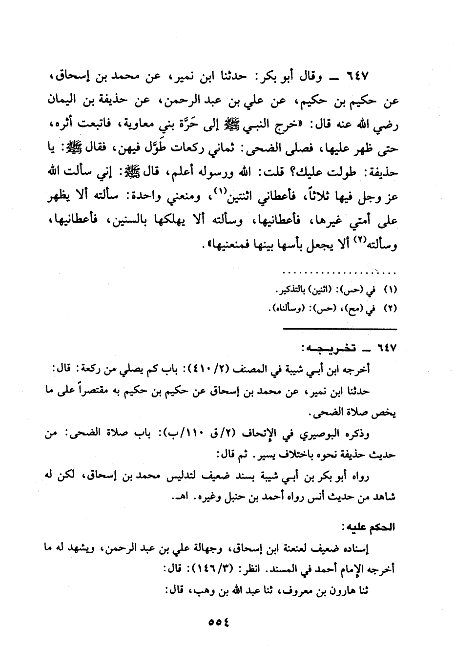 647 - وَقَالَ أَبُو بَكْرٍ حَدَّثَنَا ابْنُ نُمَيْرٍ عَنْ مُحَمَّدِ بْنِ إِسْحَاقَ عَنْ حَكِيمِ بْنِ حَكِيمٍ عَنْ عَلِيِّ بْنِ عَبْدِ الرَّحْمَنِ عَنْ حُذَيْفَةَ بْنِ الْيَمَانِ رَضِيَ اللَّهُ عَنْهُ قَالَ " خَرَجَ النَّبِيُّ صَلَّى اللَّهُ عَلَيْهِ وَسَلَّمَ إِلَى حَرَّةِ بَنِي مُعَاوِيَةَ فَاتَّبَعْتُ أَثَرَهُ حَتَّى ظَهَرَ عَلَيْهَا فَصَلَّى الضُّحَى ثَمَانِيَ رَكَعَاتٍ طَوَّلَ فِيهِنَّ فَقَالَ صَلَّى اللَّهُ عَلَيْهِ وَسَلَّمَ يَا حُذَيْفَةُ طَوَّلْتُ عَلَيْكَ قُلْتُ اللَّهُ وَرَسُولُهُ أَعْلَمُ قَالَ صَلَّى اللَّهُ عَلَيْهِ وَسَلَّمَ إِنِّي §سَأَلْتُ اللَّهَ عَزَّ وَجَلَّ فِيهَا ثَلَاثًا فَأَعْطَانِي اثْنَتَيْنِ وَمَنَعَنِي وَاحِدَةً سَأَلْتُهُ أَلَّا يُظْهِرَ عَلَى أُمَّتِي غَيْرَهَا فَأَعْطَانِيهَا وَسَأَلْتُهُ أَلَّا يُهْلِكَهَا بِالسِّنِينَ فَأَعْطَانِيهَا وَسَأَلْتُهُ أَلَّا يَجْعَلَ بَأْسَهَا بَيْنَهَا فَمَنَعَنِيهَا