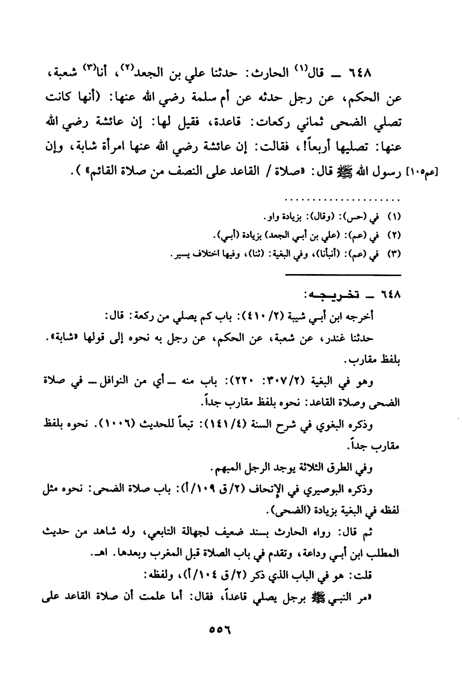 648 - قَالَ الْحَارِثُ حَدَّثَنَا عَلِيُّ بْنُ الْجَعْدِ أنا شُعْبَةُ عَنِ الْحَكَمِ عَنْ رَجُلٍ حَدَّثَهُ عَنْ أُمِّ سَلَمَةَ رَضِيَ اللَّهُ عَنْهَا (أَنَّهَا كَانَتْ تُصَلِّي الضُّحَى ثَمَانِيَ رَكَعَاتٍ قَاعِدَةً فَقِيلَ لَهَا إِنَّ عَائِشَةَ رَضِيَ اللَّهُ عَنْهَا تُصَلِّيهَا أَرْبَعًا فَقَالَتْ إِنَّ عَائِشَةَ رَضِيَ اللَّهُ عَنْهَا امْرَأَةً شَابَّةً وَإِنَّ رَسُولَ اللَّهِ صَلَّى اللَّهُ عَلَيْهِ وَسَلَّمَ قَالَ " §صَلَاةُ الْقَاعِدِ عَلَى النِّصْفِ مِنْ صَلَاةِ الْقَائِمِ "
