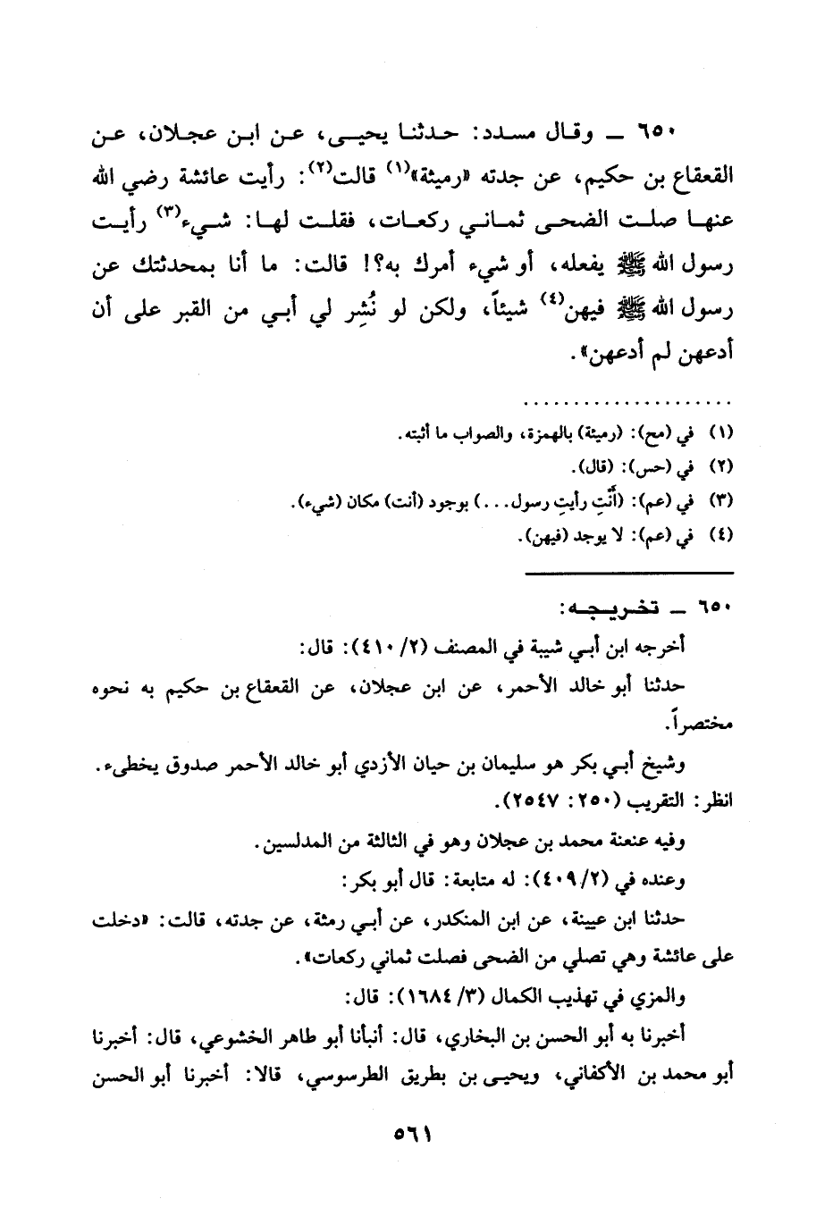 650 - وَقَالَ مُسَدَّدٌ حَدَّثَنَا يَحْيَى عَنِ ابْنِ عَجْلَانَ عَنِ الْقَعْقَاعِ بْنِ حَكِيمٍ عَنْ جَدَّتِهِ رُمَيْثَةَ قَالَتْ رَأَيْتُ عَائِشَةَ رَضِيَ اللَّهُ عَنْهَا صَلَّتِ الضُّحَى ثَمَانِيَ رَكَعَاتٍ فَقُلْتُ لَهَا شَيْءٌ رَأَيْتِ رَسُولَ اللَّهِ صَلَّى اللَّهُ عَلَيْهِ وَسَلَّمَ يَفْعَلُهُ أَوْ شَيْءٌ أَمَرَكِ بِهِ قَالَتْ مَا أَنَا بِمُحَدِّثَتُكَ عَنْ رَسُولِ اللَّهِ صَلَّى اللَّهُ عَلَيْهِ وَسَلَّمَ فِيهِنَّ شَيْئًا وَلَكِنْ §لَوْ نُشِرَ لِي أَبِي مِنَ الْقَبْرِ عَلَى أَنْ أَدَعَهُنَّ لَمْ أَدَعْهُنَّ "