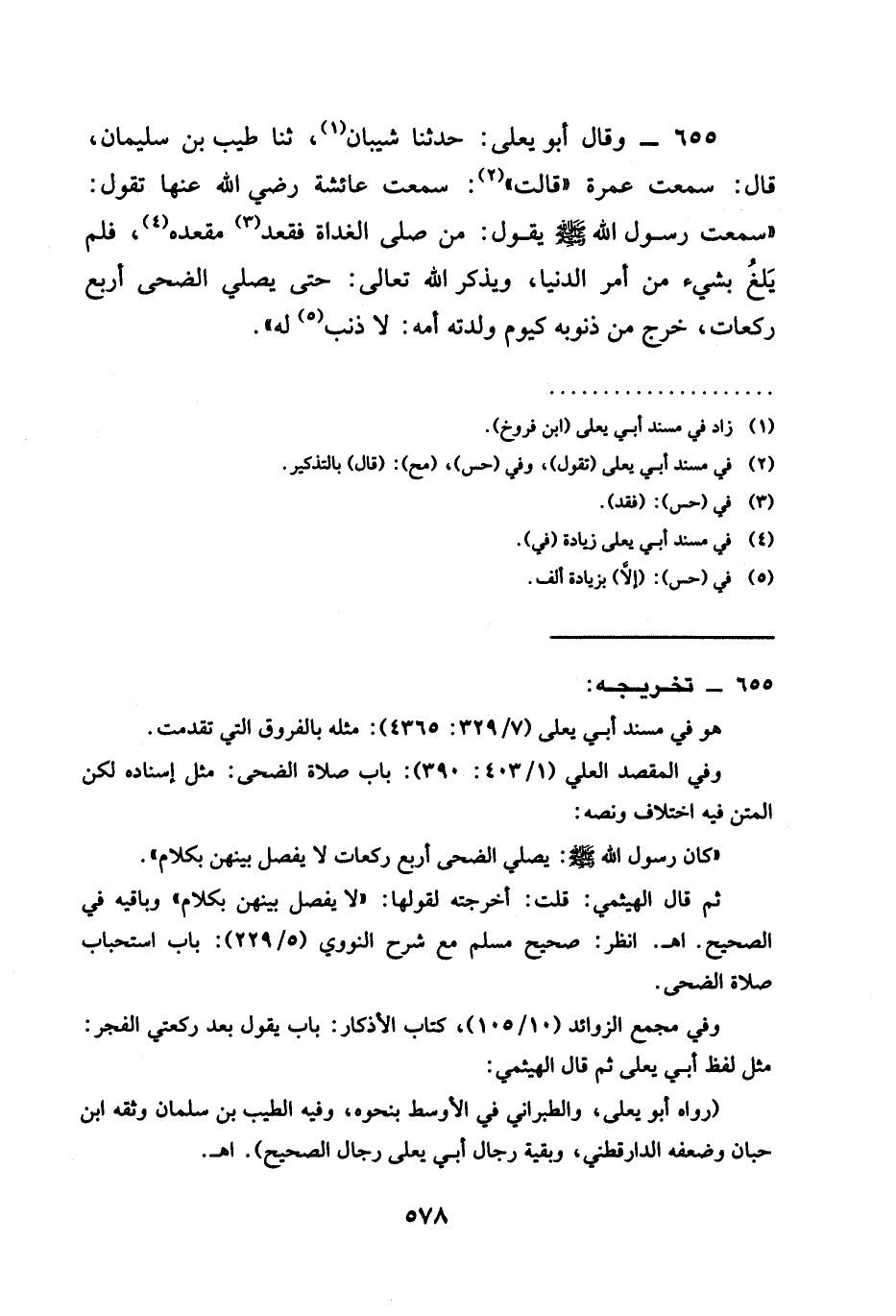 655 - وَقَالَ أَبُو يَعْلَى حَدَّثَنَا شَيْبَانُ ثنا طَيِّبُ بْنُ سُلَيْمَانَ قَالَ سَمِعْتُ عَمْرَةَ قَالَتْ سَمِعْتُ عَائِشَةَ رَضِيَ اللَّهُ عَنْهَا تَقُولُ " سَمِعْتُ رَسُولَ اللَّهِ صَلَّى اللَّهُ عَلَيْهِ وَسَلَّمَ يَقُولُ §مَنْ صَلَّى الْغَدَاةَ فَقَعَدَ مَقْعَدَهُ فَلَمْ يَلْغُ بِشَيْءٍ مِنْ أَمْرِ الدُّنْيَا وَيُذْكَرُ اللَّهَ تَعَالَى حَتَّى يُصَلِّيَ الضُّحَى أَرْبَعَ رَكَعَاتٍ خَرَجَ مِنْ ذُنُوبِهِ كَيَوْمِ وَلَدَتْهُ أُمُّهُ لَا ذَنْبَ لَهُ "