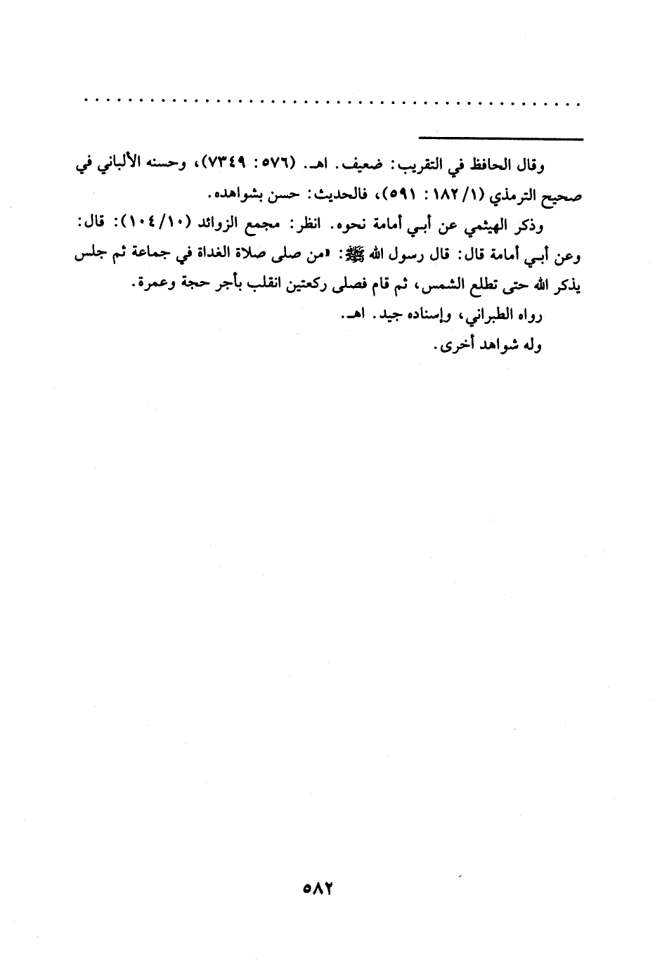 وعن أَبِي أُمَامَةَ قَالَ: قَالَ رَسُولُ اللَّهِ - صَلَّى الله عليه وسلم -: "من صلى صلاة الغداة في جماعة ثم جلس يذكر الله حتى تطلع الشمس، ثم قام فصلى ركعتين انقلب بأجر حجة وعمرة.