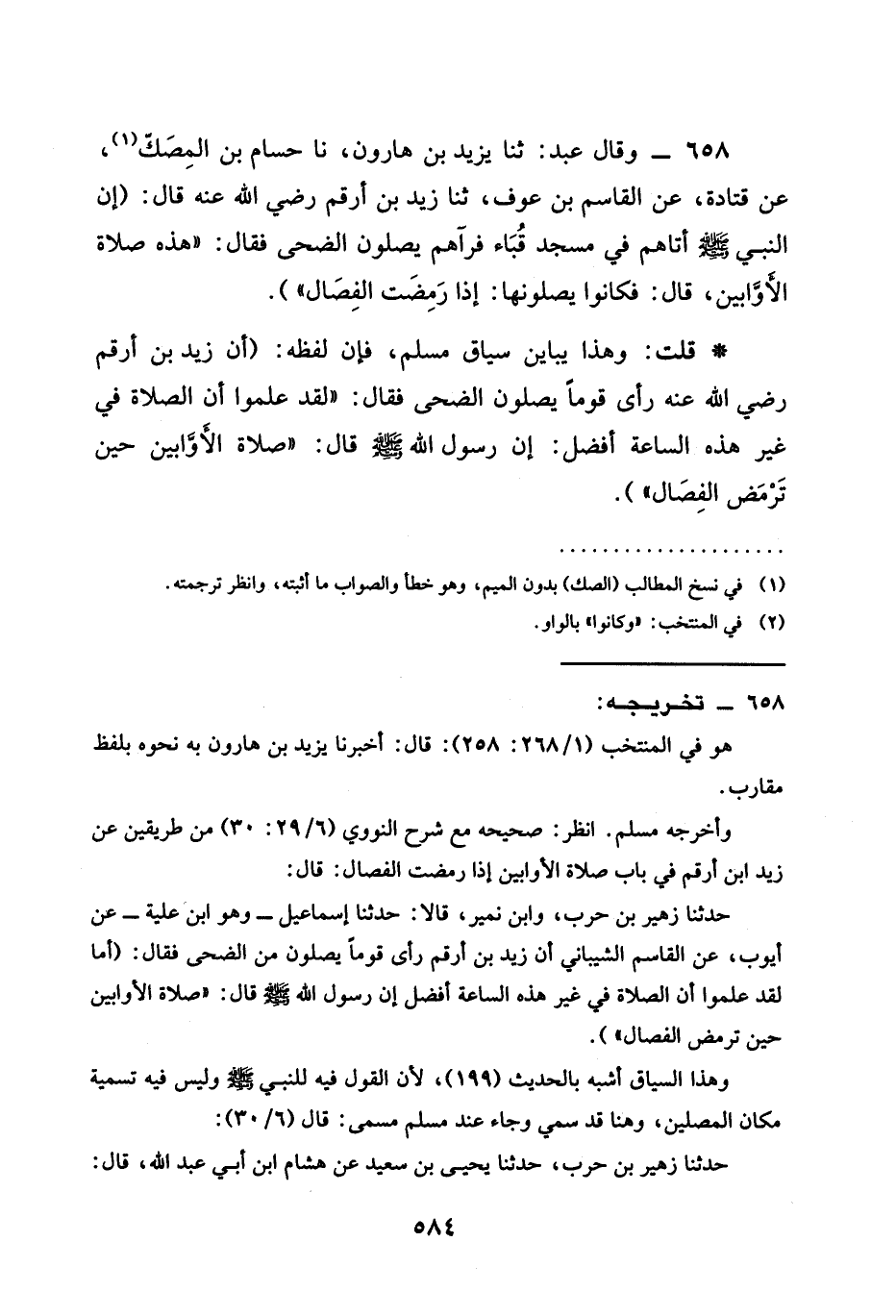 658 - وَقَالَ عَبْدٌ ثنا يَزِيدُ بْنُ هَارُونَ نا حُسَامُ بْنُ الْمِصَكِّ عَنْ قَتَادَةَ عَنِ الْقَاسِمِ بْنِ عَوْفٍ ثنا زَيْدُ بْنُ أَرْقَمَ رَضِيَ اللَّهُ عَنْهُ قَالَ (إِنَّ النَّبِيَّ صَلَّى اللَّهُ عَلَيْهِ وَسَلَّمَ أَتَاهُمْ فِي مَسْجِدِ قُبَاءٍ فَرَآهُمْ يُصَلُّونَ الضُّحَى فَقَالَ " §هَذِهِ صَلَاةُ الْأَوَّابِينَ قَالَ فَكَانُوا يُصَلُّونَهَا إِذَا رَمِضَتِ الْفِصَالُ ") قُلْتُ وَهَذَا يُبَايِنُ سِيَاقَ مُسْلِمٍ فَإِنَّ لَفْظَهُ (إِنَّ زَيْدَ بْنَ أَرْقَمَ رَضِيَ اللَّهُ عَنْهُ رَأَى قَوْمًا يُصَلُّونَ الضُّحَى فَقَالَ " لَقَدْ عَلِمُوا أَنَّ الصَّلَاةَ فِي غَيْرِ هَذِهِ السَّاعَةِ أَفْضَلُ إِنَّ رَسُولَ اللَّهِ صَلَّى اللَّهُ عَلَيْهِ وَسَلَّمَ قَالَ " صَلَاةُ الْأَوَّابِينَ حِينَ تَرْمَضُ الْفِصَالُ