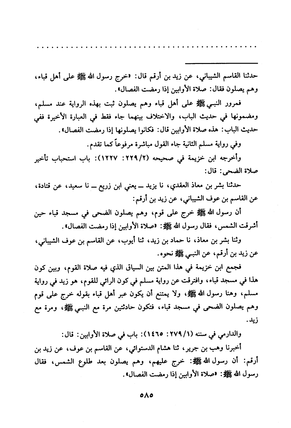 فجمع ابن خزيمة في هذا المتن بين السياق الذي فيه صلاة القوم، وبين كون هذا في مسجد قباء، وافترقت عن رواية مسلم في كون الرائي للقوم، هو زيد في رواية مسلم، وهنا رسول الله -صلى الله عليه وسلم-، ولا يمتنع أن يكون عبر أهل قباء بقوله خرج على قوم وهم يصلون الضحى في مسجد قباء، فتكون حادثتين مرة مع النبي -صلى الله عليه وسلم-، ومرة مع زيد.