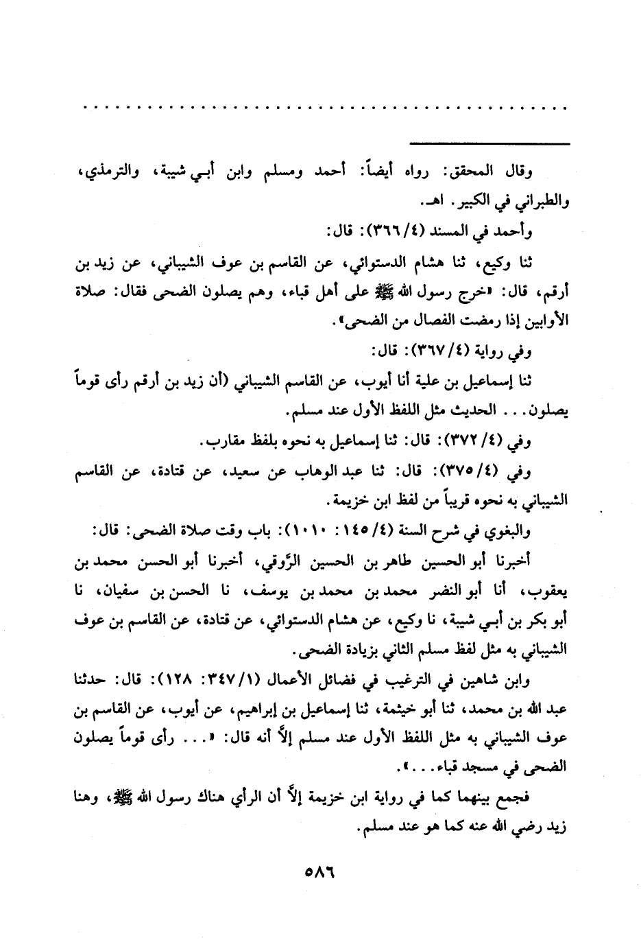 وابن شاهين في الترغيب في فضائل الأعمال (1/ 347: 128): قال: حدثنا عبد الله بن محمد، ثنا أبو خيثمة، ثنا إسماعيل بن إبراهيم، عن أيوب، عن القاسم بن عوف الشيباني به مثل اللفظ الأول عند مسلم إلَّا أنه قال: " ... رأى قومًا يصلون الضحى في مسجد قباء ... ".