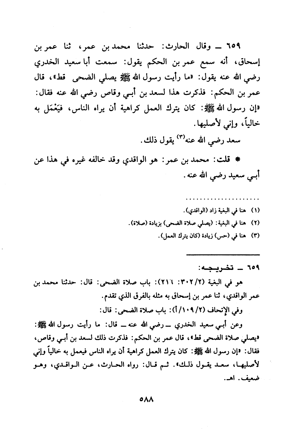 659 - وَقَالَ الْحَارِثُ حَدَّثَنَا مُحَمَّدُ بْنُ عُمَرَ ثنا عُمَرُ بْنُ إِسْحَاقَ أَنَّهُ سَمِعَ عُمَرَ بْنَ الْحَكَمِ يَقُولُ سَمِعْتُ أَبَا سَعِيدٍ الْخُدْرِيَّ رَضِيَ اللَّهُ عَنْهُ يَقُولُ " §مَا رَأَيْتُ رَسُولَ اللَّهِ صَلَّى اللَّهُ عَلَيْهِ وَسَلَّمَ يُصَلِّي الضُّحَى قَطُّ قَالَ عُمَرُ بْنُ الْحَكَمِ فَذَكَرْتُ هَذَا لِسَعْدِ بْنِ أَبِي وَقَّاصٍ رَضِيَ اللَّهُ عَنْهُ فَقَالَ " إِنَّ رَسُولَ اللَّهِ صَلَّى اللَّهُ عَلَيْهِ وَسَلَّمَ كَانَ يَتْرُكُ الْعَمَلَ كَرَاهِيَةَ أَنْ يَرَاهُ النَّاسُ فَيَعْمَلُ بِهِ خَالِيًا وَإِنِّي لَأُصَلِّيهَا سَعْدٌ رَضِيَ اللَّهُ عَنْهُ يَقُولُ ذَلِكَ قُلْتُ مُحَمَّدُ بْنُ عُمَرَ هُوَ الواقدي وقد خالفه غَيْرَهُ فِي هَذَا عَنْ أَبِي سَعِيدٍ رَضِيَ اللَّهُ عَنْهُ