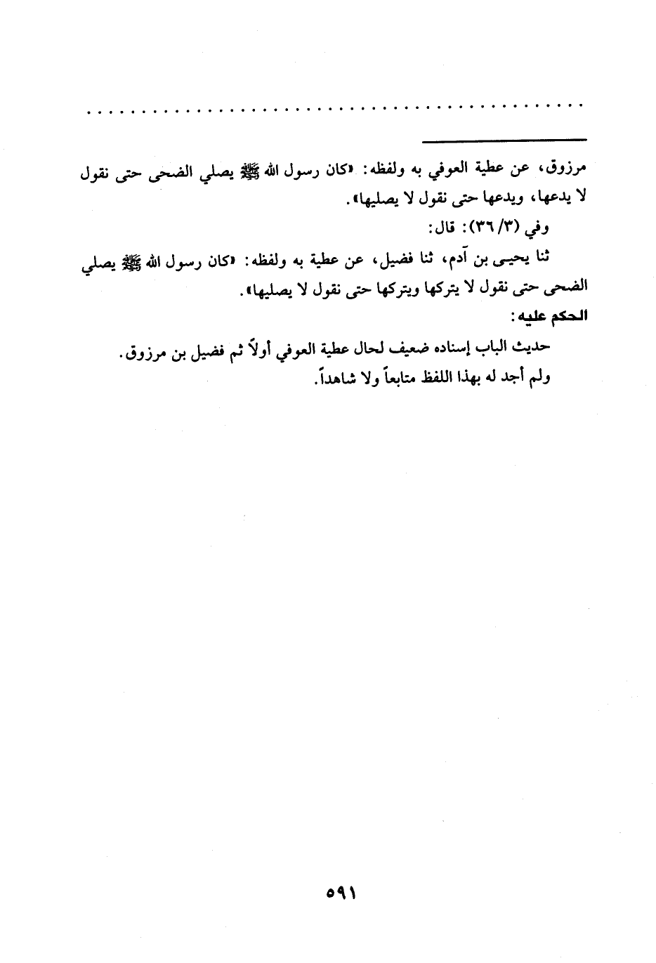 = مرزوق، عن عطية العوفي به وَلَفْظِهِ: "كَانَ رَسُولُ اللَّهِ -صَلَّى اللَّهُ عَلَيْهِ وَسَلَّمَ- يصلي الضحى حتى نقول لا يدعها، ويدعها حتى نقول لا يصليها".