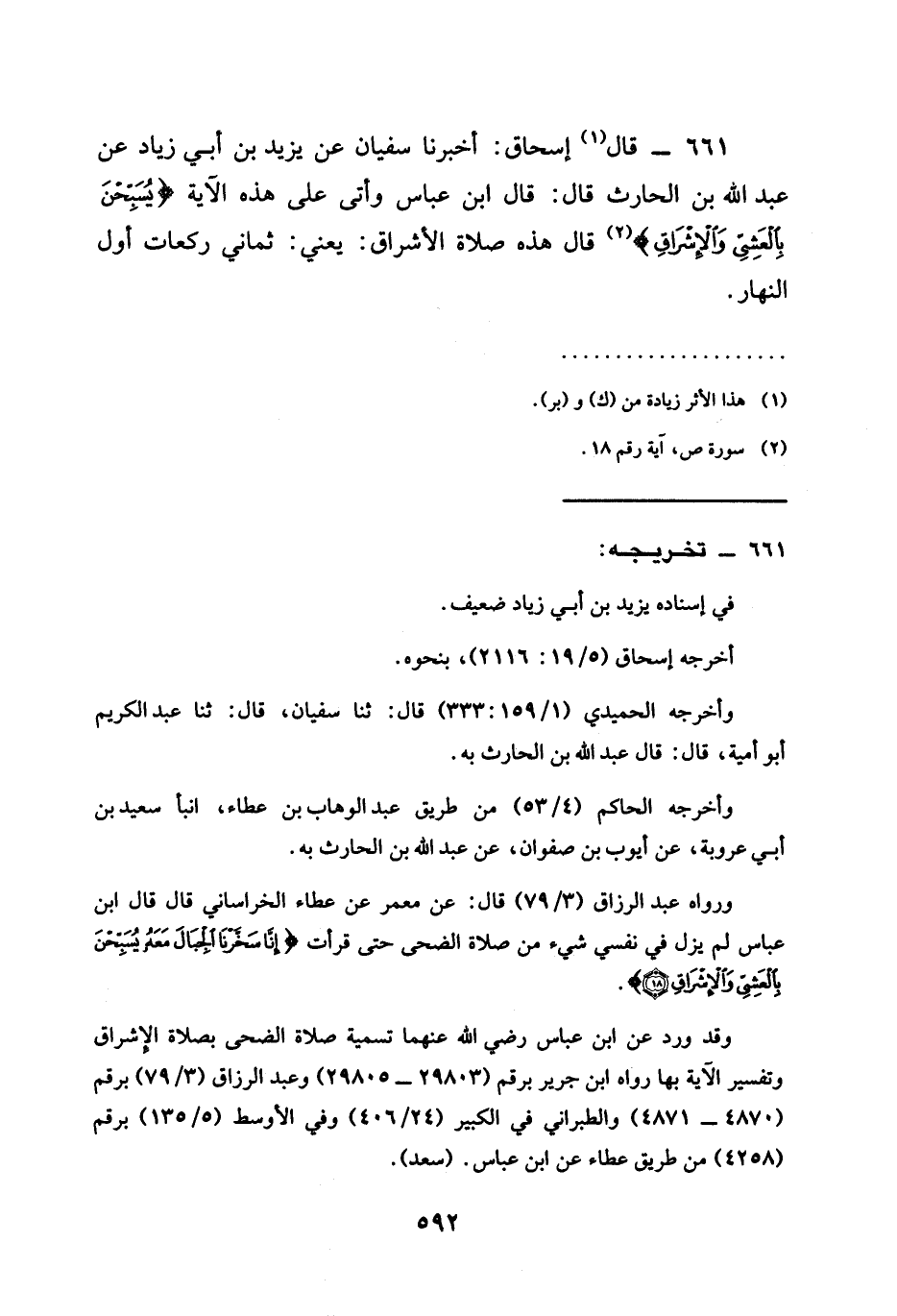 661 - قَالَ إِسْحَاقُ أَخْبَرَنَا سُفْيَانُ عَنْ يَزِيدَ بْنِ أَبِي زِيَادٍ عَنْ عَبْدِ اللَّهِ بْنِ الْحَارِثِ قَالَ قَالَ ابْنُ عَبَّاسٍ وَأَتَى عَلَى هَذِهِ الْآيَةِ {§يُسَبِّحْنَ بِالْعَشِيِّ وَالْإِشْرَاقِ} قَالَ هَذِهِ صَلَاةُ الْإِشْرَاقِ يَعْنِي ثَمَانِيَ رَكَعَاتٍ أَوَّلَ النَّهَارِ