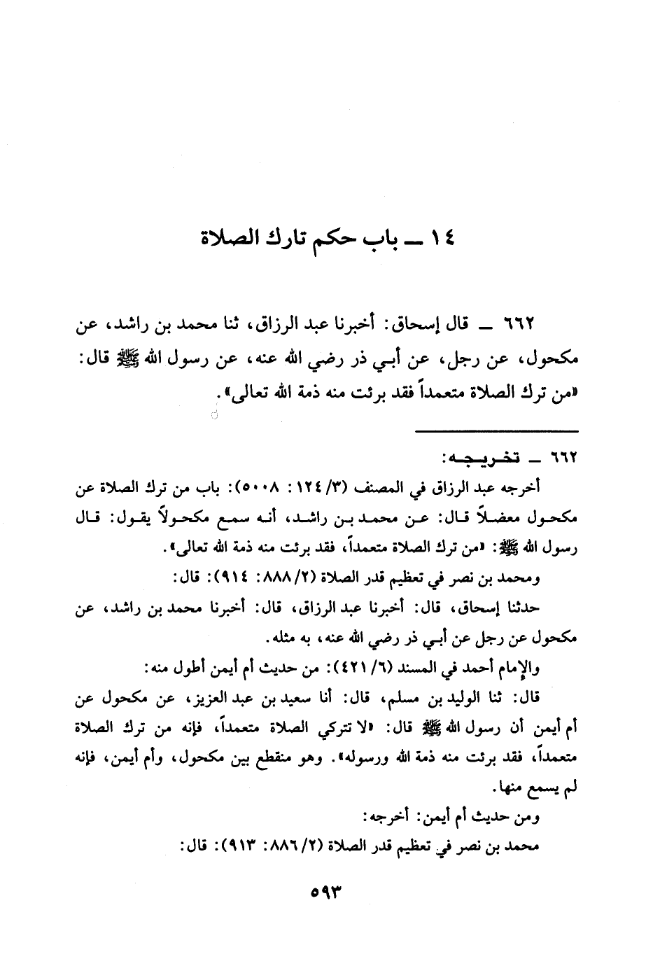 662 - قَالَ إِسْحَاقُ أَخْبَرَنَا عَبْدُ الرَّزَّاقِ ثنا مُحَمَّدُ بْنُ رَاشِدٍ عَنْ مَكْحُولٍ عَنْ رَجُلٍ عَنْ أَبِي ذَرٍّ رَضِيَ اللَّهُ عَنْهُ عَنْ رَسُولِ اللَّهِ صَلَّى اللَّهُ عَلَيْهِ وَسَلَّمَ قَالَ " §مَنْ تَرَكَ الصَّلَاةَ مُتَعَمِّدًا فَقَدْ بَرِئَتْ مِنْهُ ذِمَّةُ اللَّهِ تَعَالَى "